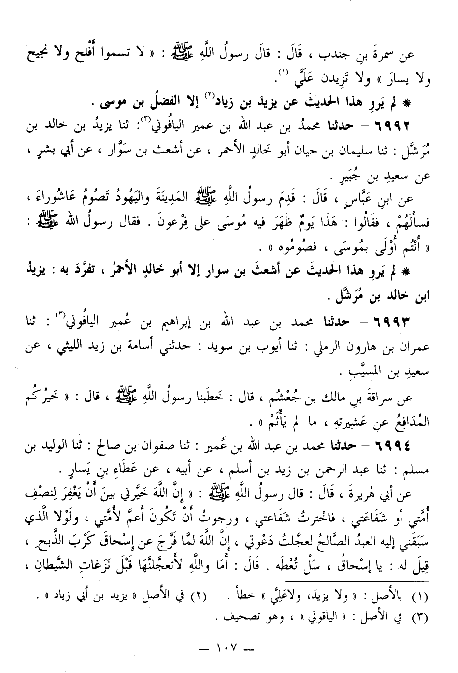 6992 - حَدَّثَنَا مُحَمَّدُ بْنُ عَبْدِ اللَّهِ بْنِ عُمَيْرٍ الْيَافُونِيُّ، ثَنَا يَزِيدُ بْنُ خَالِدِ بْنِ مُرَشَّلٍ، ثَنَا سُلَيْمَانُ بْنُ حَيَّانَ أَبُو خَالِدٍ الْأَحْمَرُ، عَنْ أَشْعَثَ بْنِ سَوَّارٍ، عَنْ أَبِي بِشْرٍ، عَنْ سَعِيدِ بْنِ جُبَيْرٍ، عَنِ ابْنِ عَبَّاسٍ قَالَ: قَدِمَ رَسُولُ اللَّهِ صَلَّى اللهُ عَلَيْهِ وَسَلَّمَ الْمَدِينَةَ وَالْيَهُودُ تَصُومُ عَاشُورَاءَ، فَسَأَلَهُمْ، فَقَالُوا: هَذَا يَوْمٌ ظَهَرَ فِيهِ مُوسَى عَلَى فِرْعَوْنَ، فَقَالَ رَسُولُ اللَّهِ صَلَّى اللهُ عَلَيْهِ وَسَلَّمَ: «§أَنْتُمْ أَوْلَى بِمُوسَى، فَصُومُوهُ»