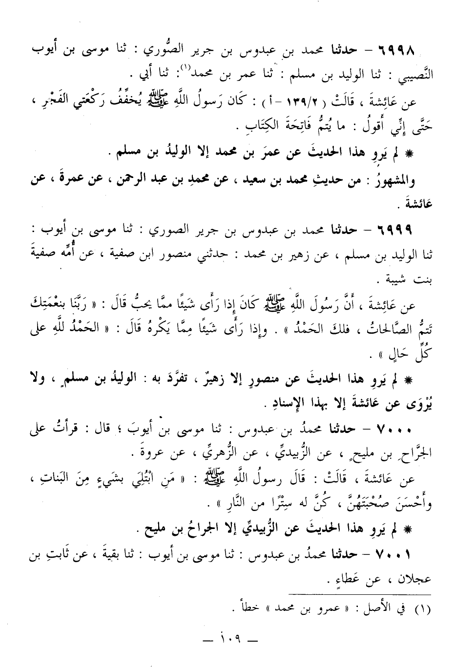 6999 - حَدَّثَنَا مُحَمَّدُ بْنُ عَبْدُوسِ بْنِ جَرِيرٍ الصُّورِيُّ، ثَنَا مُوسَى بْنُ أَيُّوبَ، ثَنَا الْوَلِيدُ بْنُ مُسْلِمٍ، عَنْ زُهَيْرِ بْنِ مُحَمَّدٍ، حَدَّثَنِي مَنْصُورُ بْنُ صَفِيَّةَ، عَنْ أُمِّهِ صَفِيَّةَ بِنْتِ شَيْبَةَ، عَنْ عَائِشَةَ، أَنَّ رَسُولَ اللَّهِ صَلَّى اللهُ عَلَيْهِ وَسَلَّمَ كَانَ §إِذَا رَأَى شَيْئًا مِمَّا يُحِبُّ قَالَ: «رَبَّنَا بِنِعْمَتِكَ تَتِمُّ الصَّالِحَاتُ، فَلَكَ الْحَمْدُ» ، وَإِذَا رَأَى شَيْئًا مِمَّا يَكْرَهُ قَالَ: «الْحَمْدُ لِلَّهِ عَلَى كُلِّ حَالٍ»