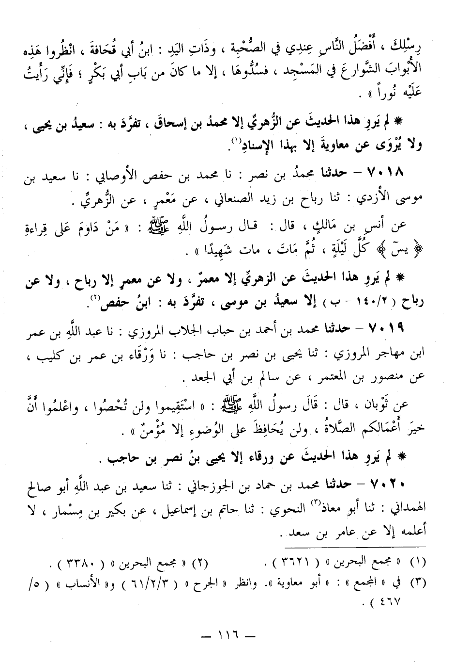 7018 - حَدَّثَنَا مُحَمَّدُ بْنُ نَصْرٍ، نَا مُحَمَّدُ بْنُ حَفْصٍ الْأَوْصابيُّ، نَا سَعِيدُ بْنُ مُوسَى الْأَزْدِيُّ، ثَنَا رَبَاحُ بْنُ زَيْدٍ الصَّنْعَانِيُّ، عَنْ مَعْمَرٍ، عَنِ الزُّهْرِيِّ، عَنْ أَنَسِ بْنِ مَالِكٍ قَالَ: قَالَ رَسُولُ اللَّهِ صَلَّى اللهُ عَلَيْهِ وَسَلَّمَ: «§مِنْ دَاوَمَ عَلَى قِرَاءَةِ يس كُلَّ لَيْلَةٍ، ثُمَّ مَاتَ، مَاتَ شَهِيدًا»
