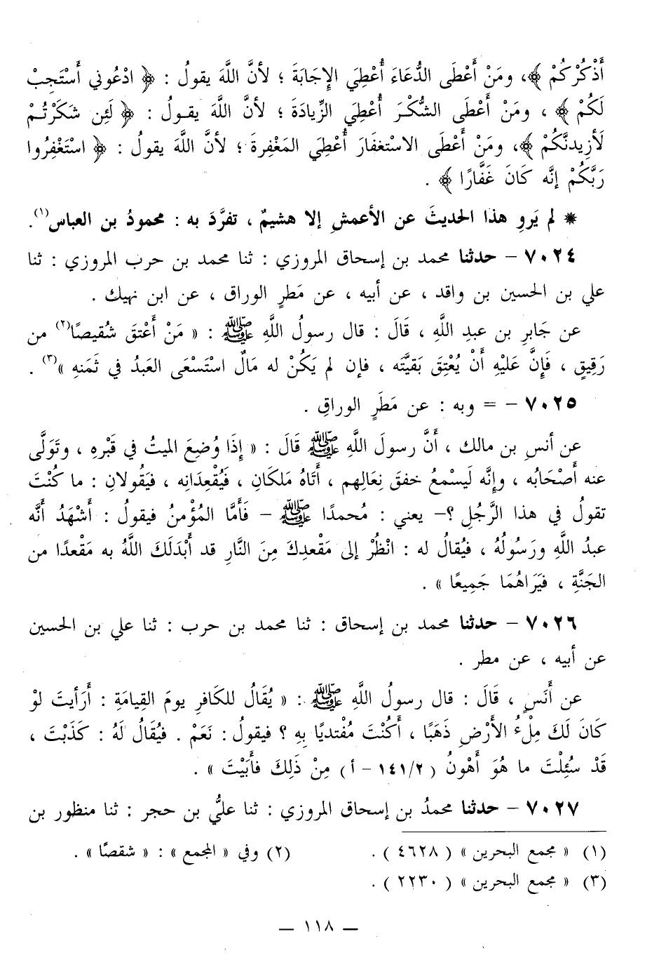 7025 - وَبِهِ: عَنْ مَطَرٍ الْوَرَّاقِ، عَنْ أَنَسِ بْنِ مَالِكٍ، أَنَّ رَسُولَ اللَّهِ صَلَّى اللهُ عَلَيْهِ وَسَلَّمَ قَالَ: «§إِذَا وُضِعَ الْمَيِّتُ فِي قَبْرِهِ، وَتَوَلَّى عَنْهُ أَصْحَابُهُ، وَإِنَّهُ لَيَسْمَعُ خَفْقَ نِعَالِهِمْ، أَتَاهُ مَلَكَانِ، فَيُقْعِدَانِهِ، فَيَقُولَانِ: مَا كُنْتَ تَقُولُ فِي هَذَا الرَّجُلِ؟ يَعْنِي مُحَمَّدًا صَلَّى اللهُ عَلَيْهِ وَسَلَّمَ، فَأَمَّا الْمُؤْمِنُ فَيَقُولُ: أَشْهَدُ أَنَّهُ عَبْدُ اللَّهِ وَرَسُولُهُ، فَيُقَالُ لَهُ: انْظُرْ إِلَى مَقْعَدِكَ مِنَ النَّارِ قَدْ أَبْدَلَكَ اللَّهُ بِهِ مَقْعَدًا مِنَ الْجَنَّةِ، فَيَرَاهُمَا جَمِيعًا»