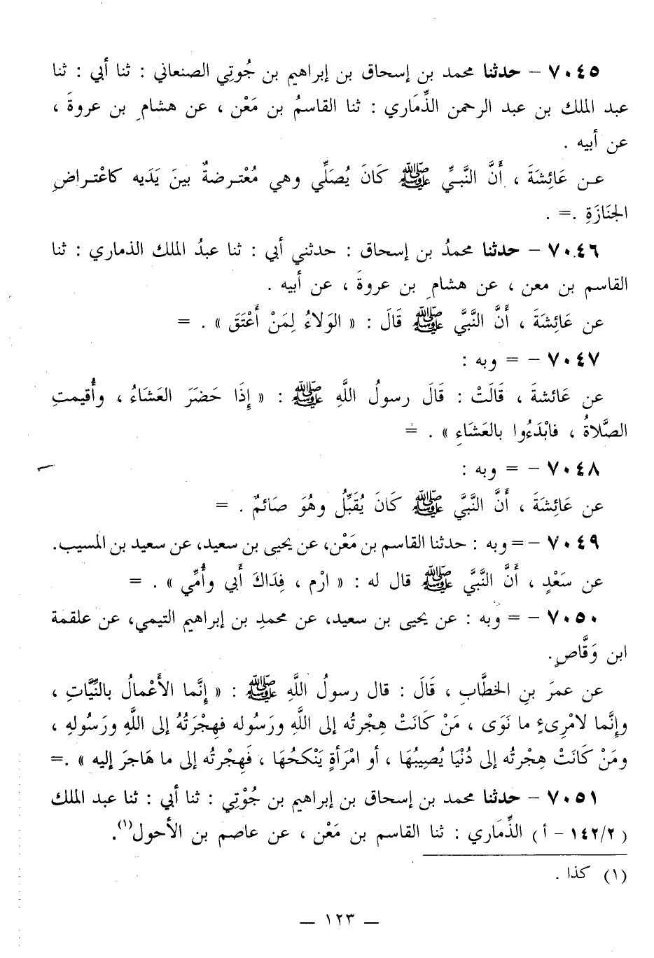 7045 - حَدَّثَنَا مُحَمَّدُ بْنُ إِسْحَاقَ بْنِ إِبْرَاهِيمَ بْنِ جُوتِي الصَّنْعَانِيُّ، ثَنَا أَبِي، ثَنَا عَبْدُ الْمَلِكِ بْنُ عَبْدِ الرَّحْمَنِ الذِّمَارِيُّ، ثَنَا الْقَاسِمُ بْنُ مَعْنٍ، عَنْ هِشَامِ بْنِ عُرْوَةَ، عَنْ أَبِيهِ، عَنْ عَائِشَةَ، «أَنَّ النَّبِيَّ صَلَّى اللهُ عَلَيْهِ وَسَلَّمَ كَانَ §يُصَلِّي وَهِيَ مُعْتَرِضَةٌ بَيْنَ يَدَيْهِ كَاعْتِرَاضِ الْجَنَازَةِ»