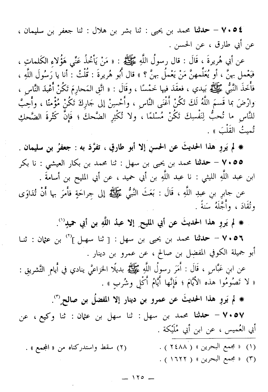 7054 - حَدَّثَنَا مُحَمَّدُ بْنُ يَحْيَى، ثَنَا بِشْرُ بْنُ هِلَالٍ، ثَنَا جَعْفَرُ بْنُ سُلَيْمَانَ، عَنْ أَبِي طَارِقٍ، عَنِ الْحَسَنِ، عَنْ أَبِي هُرَيْرَةَ قَالَ: قَالَ رَسُولُ اللَّهِ صَلَّى اللهُ عَلَيْهِ وَسَلَّمَ: «مَنْ يَأْخُذُ عَنِّي هَؤُلَاءِ الْكَلِمَاتِ، فَيَعْمَلُ بِهِنَّ، أَوْ يُعَلِّمُهُنَّ مَنْ يَعْمَلُ بِهِنَّ؟» قَالَ أَبُو هُرَيْرَةَ: قُلْتُ: أَنَا يَا رَسُولَ اللَّهِ، فَأَخَذَ النَّبِيُّ صَلَّى اللهُ عَلَيْهِ وَسَلَّمَ بِيَدِي، فَعَقَدَ فِيهِمَا خَمْسًا، وَقَالَ: «§اتَّقِ الْمَحَارِمَ تَكُنْ أَعْبُدَ النَّاسِ، وَارْضَ بِمَا قَسَمَ اللَّهُ لَكَ تَكُنْ أَغْنَى النَّاسِ، وَأَحْسِنْ إِلَى جَارِكَ تَكُنْ مُؤْمِنًا، وَأَحِبَّ لِلنَّاسِ مَا تُحِبُّ لِنَفْسِكَ تَكُنْ مُسْلِمًا، وَلَا تُكْثِرِ الضَّحِكَ، فَإِنَّ كَثْرَةَ الضَّحِكِ تُمِيتُ الْقَلْبَ»