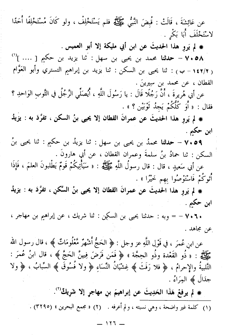 7060 - وَبِهِ: حَدَّثَنَا يَحْيَى بْنُ السَّكَنِ، ثَنَا شَرِيكٌ، عَنْ إِبْرَاهِيمَ بْنِ مُهَاجِرٍ، عَنْ مُجَاهِدٍ، عَنِ ابْنِ عُمَرَ، فِي قَوْلِ اللَّهِ عَزَّ وَجَلَّ: {§الْحَجُّ أَشْهُرٌ مَعْلُومَاتٌ} [البقرة: 197] قَالَ رَسُولُ اللَّهِ صَلَّى اللهُ عَلَيْهِ وَسَلَّمَ: «ذُو الْقَعْدَةِ وَذُو الْحِجَّةِ»