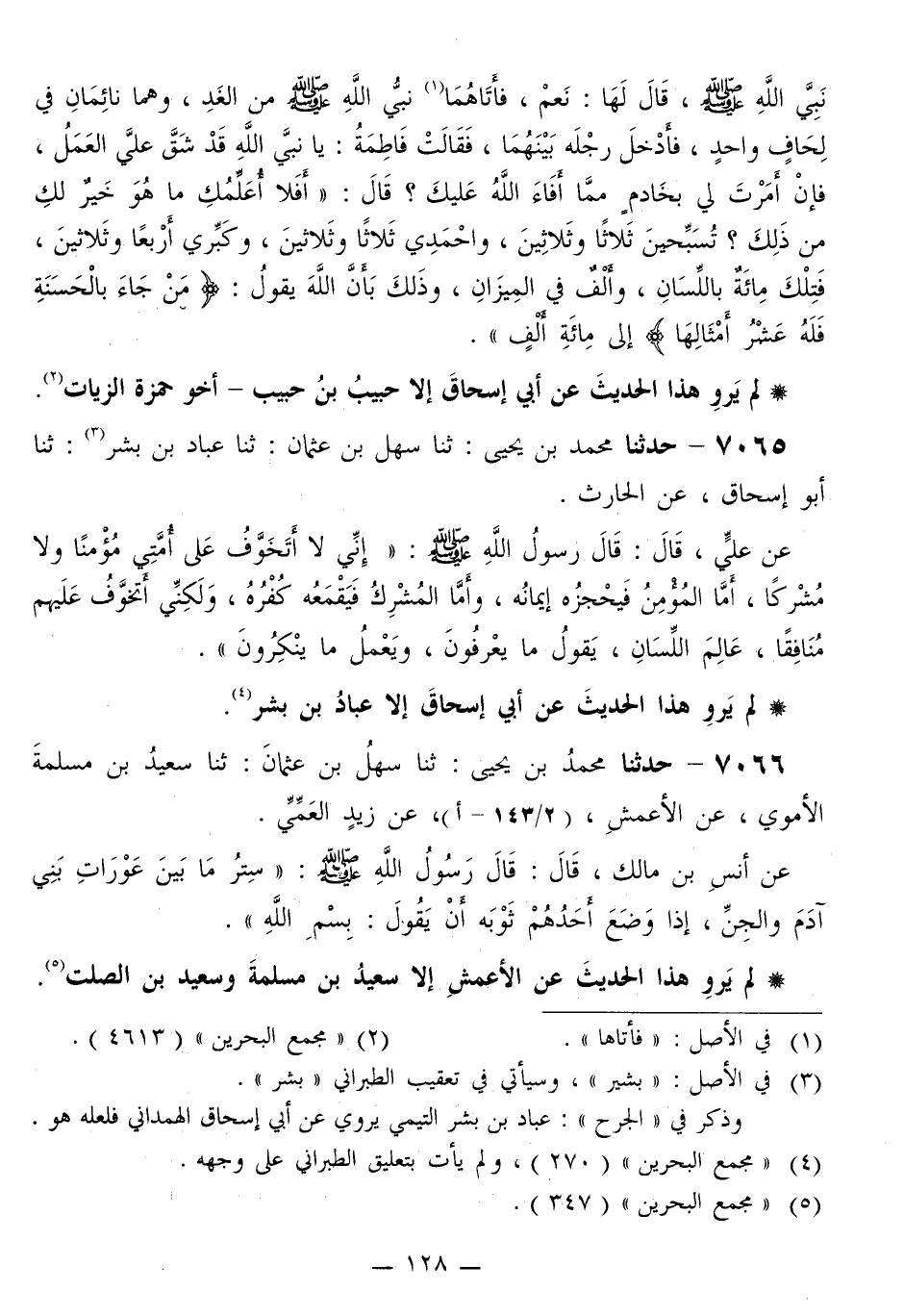 7065 - حَدَّثَنَا مُحَمَّدُ بْنُ يَحْيَى، ثَنَا سَهْلُ بْنُ عُثْمَانَ، ثَنَا عَبَّادُ بْنُ بِشْرٍ، ثَنَا أَبُو إِسْحَاقَ، عَنِ الْحَارِثِ، عَنْ عَلِيٍّ قَالَ: قَالَ رَسُولُ اللَّهِ صَلَّى اللهُ عَلَيْهِ وَسَلَّمَ: «إِنِّي §لَا أَتَخَوَّفُ عَلَى أُمَّتِي مُؤْمِنًا وَلَا مُشْرِكًا، أَمَّا الْمُؤْمِنُ فَيَحْجِزُهُ إِيمَانُهُ، وَأَمَّا الْمُشْرِكُ فَيَقْمَعُهُ كُفْرُهُ، وَلَكِنِّي أَتَخَوَّفُ عَلَيْهِمْ مُنَافِقًا، عَالِمَ اللِّسَانِ، يَقُولُ مَا يَعْرِفُونَ، وَيَعْمَلُ مَا يُنْكِرُونَ»