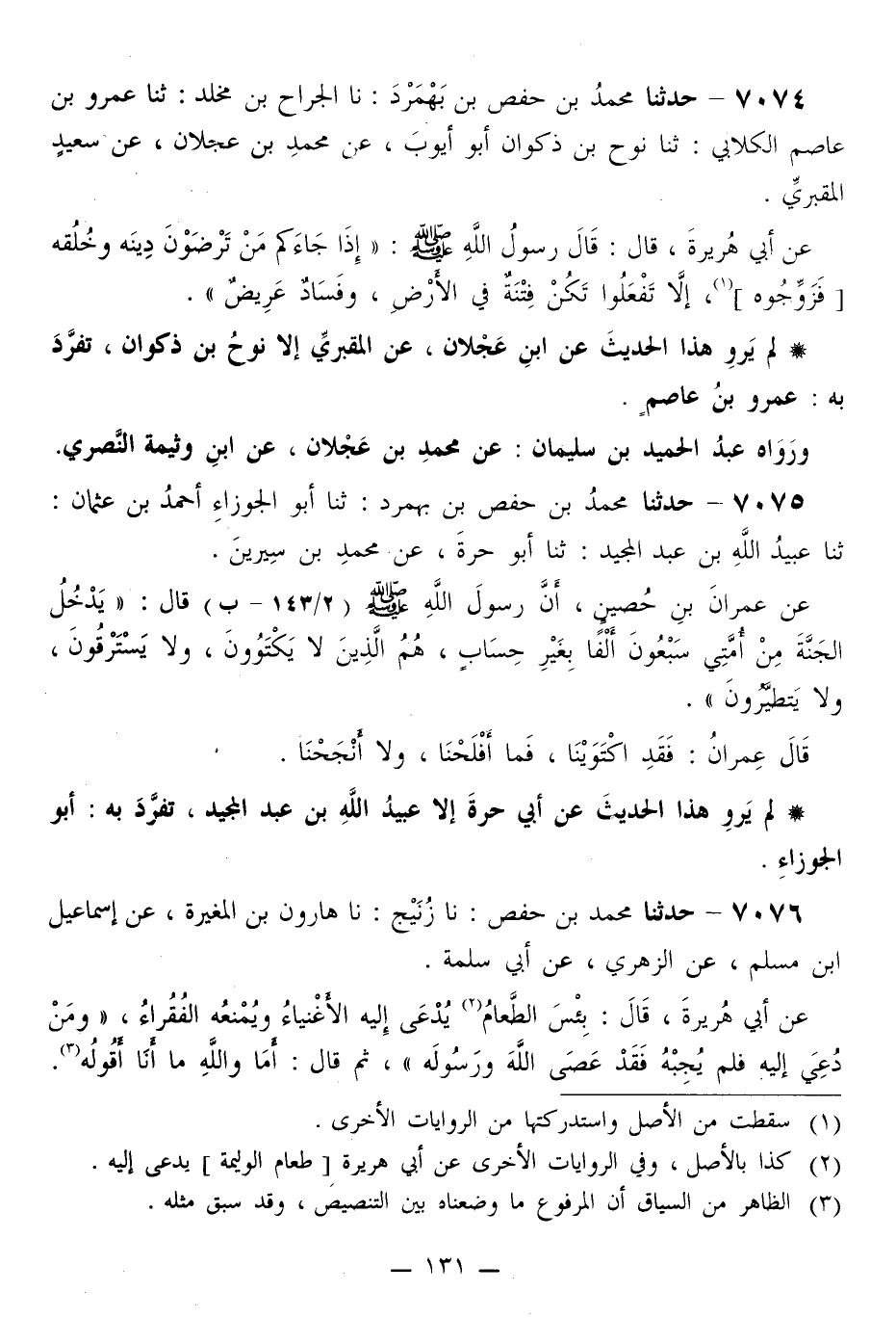 7075 - حَدَّثَنَا مُحَمَّدُ بْنُ حَفْصِ بْنِ بَهْمَرْدَ، ثَنَا أَبُو الْجَوْزَاءِ أَحْمَدُ بْنُ عُثْمَانَ، ثَنَا عُبَيْدُ اللَّهِ بْنُ عَبْدِ الْمَجِيدِ، ثَنَا أَبُو حَرَّةَ، عَنْ مُحَمَّدِ بْنِ سِيرِينَ، عَنْ عِمْرَانَ بْنِ حُصَيْنٍ، أَنَّ رَسُولَ اللَّهِ صَلَّى اللهُ عَلَيْهِ وَسَلَّمَ قَالَ: «§يَدْخُلُ الْجَنَّةَ مِنْ أُمَّتِي سَبْعُونَ أَلْفًا بِغَيْرِ حِسَابٍ، هُمُ الَّذِينَ لَا يَكْتَوُونَ، وَلَا يَسْتَرْقُونَ، وَلَا يَتَطَيَّرُونَ» قَالَ عِمْرَانُ: «فَقَدِ اكْتَوَيْنا، فَمَا أَفْلَحْنَا، وَلَا أَنْجَحْنَا»