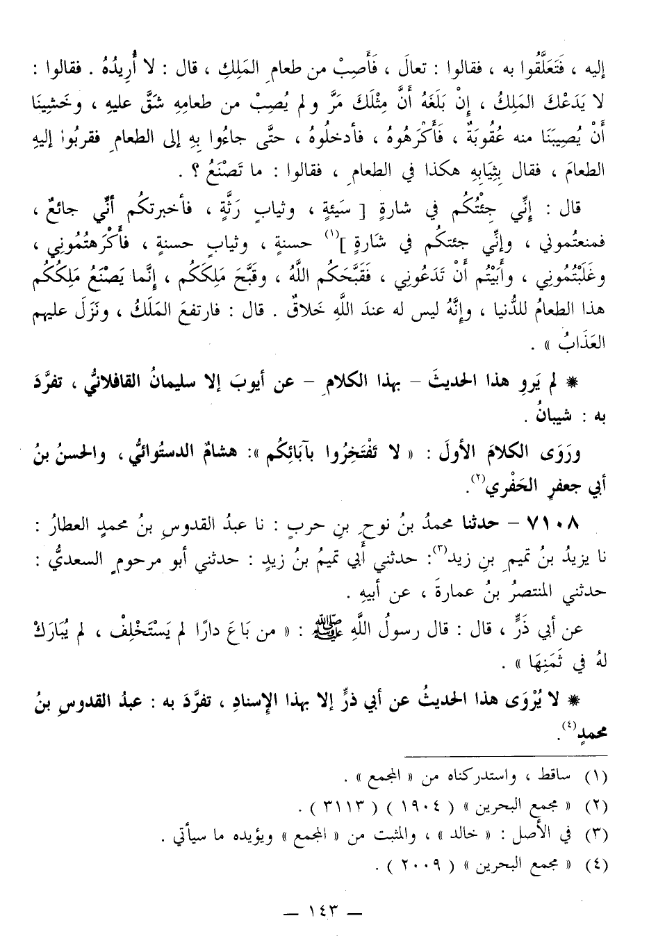 7108 - حَدَّثَنَا مُحَمَّدُ بْنُ نُوحِ بْنِ حَرْبٍ، نَا عَبْدُ الْقُدُّوسِ بْنُ مُحَمَّدٍ الْعَطَّارُ، نَا يَزِيدُ بْنُ تَمِيمِ بْنِ زَيْدٍ، حَدَّثَنِي أَبِي تَمِيمُ بْنُ زَيْدٍ، حَدَّثَنِي أَبُو مَرْحُومٍ السَّعْدِيُّ، حَدَّثَنِي الْمُنْتَصِرُ بْنُ عُمَارَةَ، عَنْ أَبِيهِ، عَنْ أَبِي ذَرٍّ قَالَ: قَالَ رَسُولُ اللَّهِ صَلَّى اللهُ عَلَيْهِ وَسَلَّمَ: «§مَنْ بَاعَ دَارًا لَمْ يَسْتَخْلِفْ، لَمْ يُبَارَكْ لَهُ فِي ثَمَنِهَا»