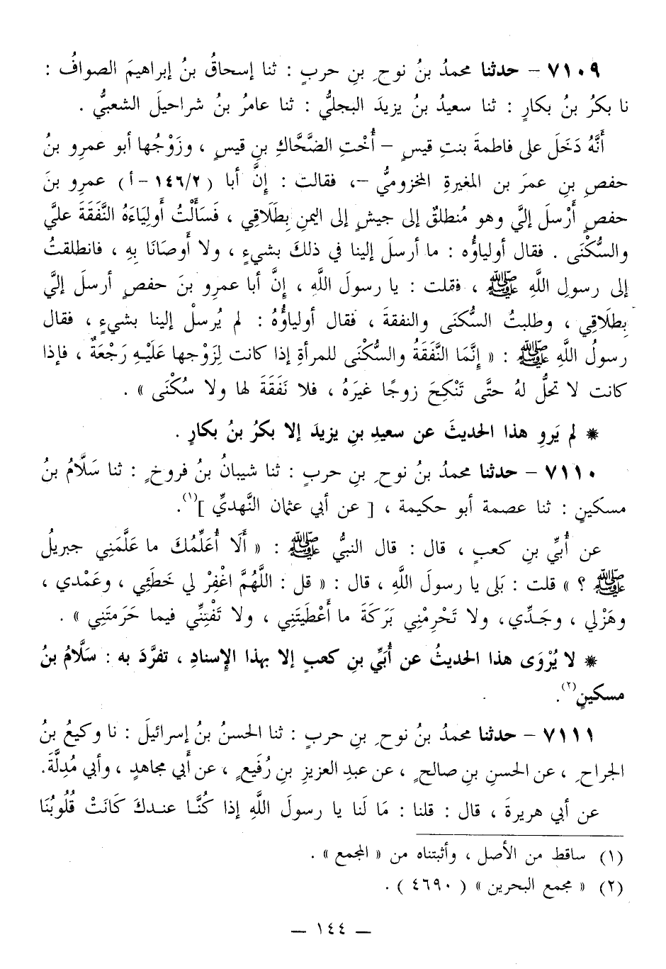 7110 - حَدَّثَنَا مُحَمَّدُ بْنُ نُوحِ بْنِ حَرْبٍ، ثَنَا شَيْبَانُ بْنُ فَرُّوخٍ، ثَنَا سَلَّامُ بْنُ مِسْكِينٍ، ثَنَا عِصْمَةُ أَبُو حُكَيْمَةَ، عَنْ أَبِي عُثْمَانَ النَّهْدِيِّ، عَنْ أُبَيِّ بْنِ كَعْبٍ قَالَ: قَالَ النَّبِيُّ صَلَّى اللهُ عَلَيْهِ وَسَلَّمَ: «أَلَا أُعَلِّمُكَ مَا عَلَّمَنِي جِبْرِيلُ صَلَّى اللهُ عَلَيْهِ وَسَلَّمَ؟» ، قُلْتُ: بَلَى يَا رَسُولَ اللَّهِ قَالَ: «قُلْ: §اللَّهُمَّ اغْفِرْ لِي خَطَئِي، وَعَمْدِي، وَهَزْلِي، وَجَدِّي، وَلَا تَحْرِمْني بَرَكَةَ مَا أَعْطَيْتَنِي، وَلَا تَفْتِنِّي فِيمَا حَرَمْتَنِي»
