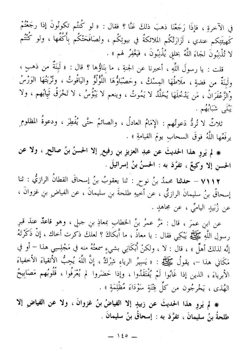 7112 - حَدَّثَنَا مُحَمَّدُ بْنُ نُوحٍ، ثَنَا يَعْقُوبُ بْنُ إِسْحَاقَ الْقَطَّانُ الرَّازِيُّ، ثَنَا إِسْحَاقُ بْنُ سُلَيْمَانَ الرَّازِيُّ، عَنْ أَخِيهِ طَلْحَةَ بْنِ سُلَيْمَانَ، عَنِ الْفُضَيْلِ بْنِ غَزْوَانَ، عَنْ زُبَيْدٍ الْيَامِيِّ، عَنْ مُجَاهِدٍ، عَنِ ابْنِ عُمَرَ قَالَ: مَرَّ عُمَرُ بْنُ الْخَطَّابِ بِمُعَاذِ بْنِ جَبَلٍ، وَهُوَ قَاعِدٌ عِنْدَ قَبْرِ رَسُولِ اللَّهِ صَلَّى اللهُ عَلَيْهِ وَسَلَّمَ يَبْكِي، فَقَالَ: يَا مُعَاذُ، مَا أَبْكَاكَ؟ لَعَلَّكَ ذَكَرْتَ أَخَاكَ، إِنْ ذَكَرْتَهُ إِنَّهُ لِذَلِكَ أَهْلٌ قَالَ: لَا، وَلَكِنْ أَبْكَاني بِشَيْءٍ سَمِعْتُهُ مِنْهُ فِي مَجْلِسِي هَذَا، أَوْ فِي مَكَانِي هَذَا، يَقُولُ صَلَّى اللهُ عَلَيْهِ وَسَلَّمَ: «§يَسِيرُ الرِّيَاءِ شِرْكٌ، إِنَّ اللَّهَ يُحِبُّ الْأَتْقِيَاءَ الْأَخْفِيَاءَ الْأَبْرِيَاءَ، الَّذِينَ إِذَا غَابُوا لَمْ يُفْتَقَدُوا، وَإِذَا حَضَرُوا لَمْ يُعْرَفُوا، قُلُوبُهُمْ مَصَابِيحُ الْهُدَى، يَخْرُجُونَ مِنْ كُلِّ فِتْنَةٍ سَوْدَاءَ مُظْلِمَةٍ»