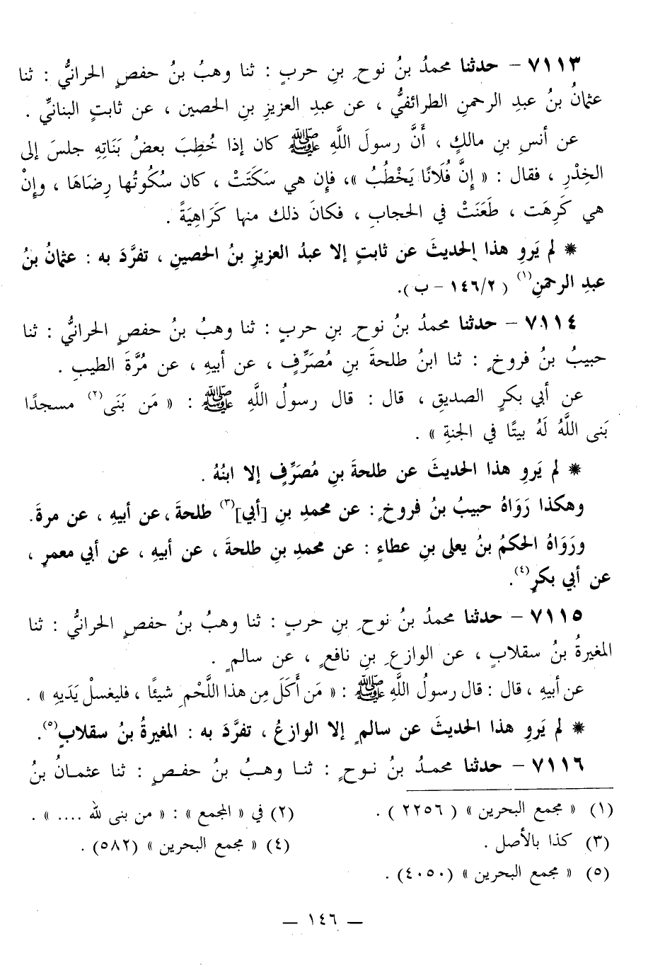 7114 - حَدَّثَنَا مُحَمَّدُ بْنُ نُوحِ بْنِ حَرْبٍ، ثَنَا وَهْبُ بْنُ حَفْصٍ الْحَرَّانِيُّ، ثَنَا حَبِيبُ بْنُ فَرُّوخٍ، ثَنَا ابْنُ طَلْحَةَ بْنِ مُصَرِّفٍ، عَنْ أَبِيهِ، عَنْ مُرَّةَ الطَّيِّبِ، عَنْ أَبِي بَكْرٍ الصِّدِّيقِ قَالَ: قَالَ رَسُولُ اللَّهِ صَلَّى اللهُ عَلَيْهِ وَسَلَّمَ: «§مَنْ بَنَى مَسْجِدًا بَنَى اللَّهُ لَهُ بَيْتًا فِي الْجَنَّةِ»