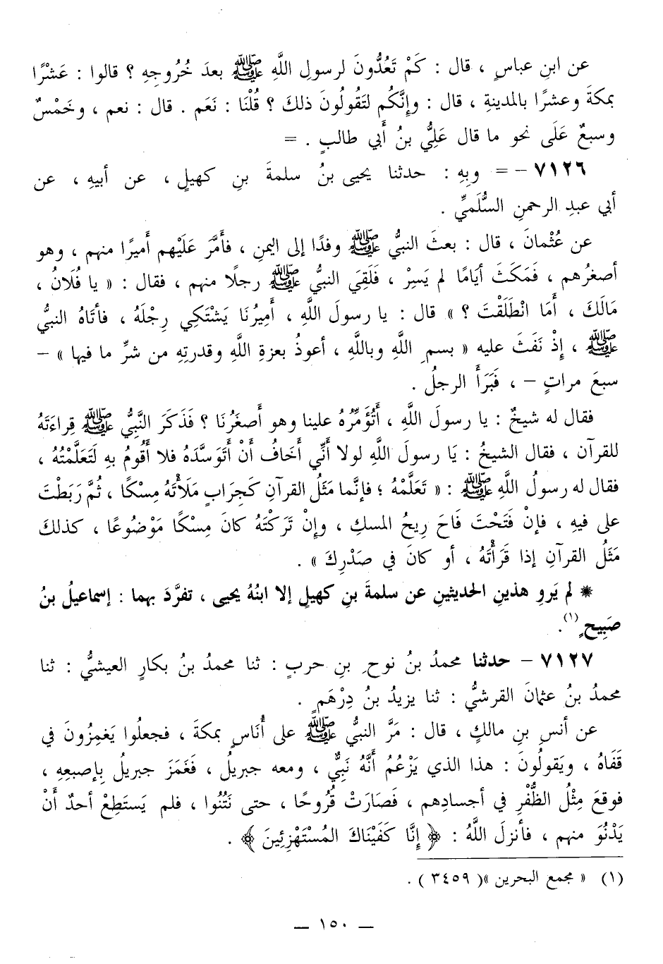 7126 - وَبِهِ: حَدَّثَنَا يَحْيَى بْنُ سَلَمَةَ بْنِ كُهَيْلٍ، عَنْ أَبِيهِ، عَنْ أَبِي عَبْدِ الرَّحْمَنِ السُّلَمِيِّ، عَنْ عُثْمَانَ قَالَ: بَعَثَ النَّبِيُّ صَلَّى اللهُ عَلَيْهِ وَسَلَّمَ وَفْدًا إِلَى الْيَمَنِ، فَأَمَّرَ عَلَيْهِمْ أَمِيرًا مِنْهُمْ، وَهُوَ أَصْغَرُهُمْ، فَمَكَثَ أَيَّامًا لَمْ يَسِرْ، فَلَقِيَ النَّبِيُّ صَلَّى اللهُ عَلَيْهِ وَسَلَّمَ رَجُلًا مِنْهُمْ، فَقَالَ: «يَا فُلَانُ، مَا لَكَ، أَمَا انْطَلَقْتَ؟» قَالَ: يَا رَسُولَ اللَّهِ، أَمِيرُنَا يَشْتَكِي رِجْلَهُ، فَأَتَاهُ النَّبِيُّ صَلَّى اللهُ عَلَيْهِ وَسَلَّمَ، إِذْ نَفَثَ عَلَيْهِ: «بِسْمِ اللَّهِ وَبِاللَّهِ، أَعُوذُ بِعِزَّةِ اللَّهِ وَقُدْرَتِهِ مِنْ شَرُّ مَا فِيهَا» ، سَبْعَ مَرَّاتٍ، فَبَرَأَ الرَّجُلُ فَقَالَ لَهُ شَيْخٌ: يَا رَسُولَ اللَّهِ، أَتُؤَمِّرُهَ عَلَيْنَا وَهُوَ أَصْغَرُنَا؟ فَذَكَرَ النَّبِيُّ صَلَّى اللهُ عَلَيْهِ وَسَلَّمَ قِرَاءَتَهُ لِلْقُرْآنِ، فَقَالَ الشَّيْخُ: يَا رَسُولَ اللَّهِ لَوْلَا أَنِّي أَخَافُ أَنْ أَتَوَسَّدَهُ فَلَا أَقُومُ بِهِ لَتَعَلَّمْتُهُ، فَقَالَ لَهُ رَسُولُ اللَّهِ صَلَّى اللهُ عَلَيْهِ وَسَلَّمَ: «تَعَلَّمْهُ، فَإِنَّمَا §مِثْلُ الْقُرْآنِ كَجِرَابٍ مَلَأْتَهُ مِسْكًا، ثُمَّ رَبَطْتَ عَلَى فِيهِ، فَإِنْ فَتَحْتَ فاحَ رِيحُ الْمِسْكِ، وَإِنْ تَرَكَتْهُ كَانَ مِسْكًا مَوْضُوعًا، كَذَلِكَ مَثَلُ الْقُرْآنِ إِذَا قَرَأْتَهُ، أَوْ كَانَ فِي صَدْرِكَ»