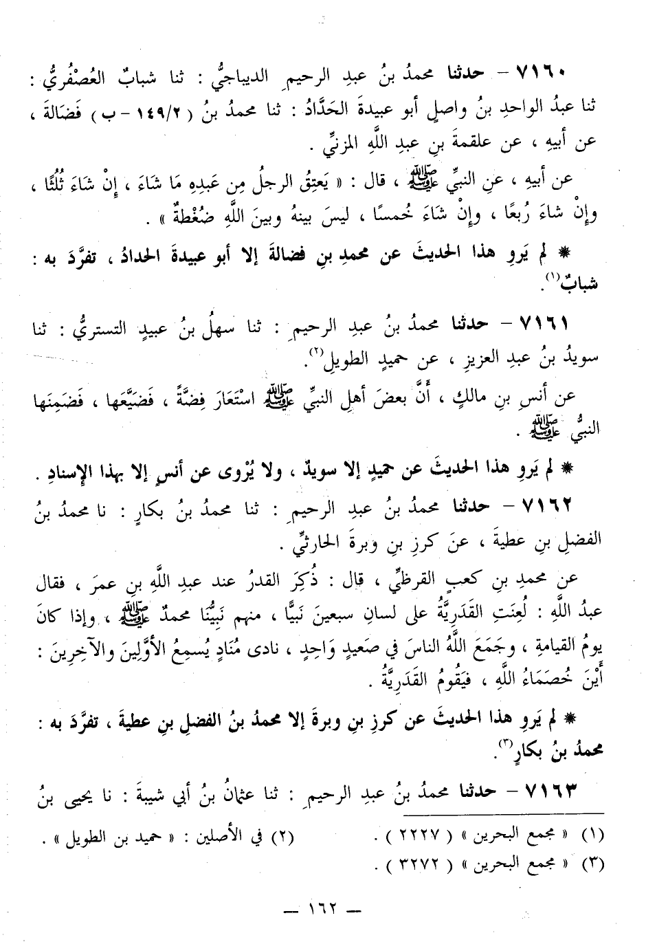 7160 - حَدَّثَنَا مُحَمَّدُ بْنُ عَبْدِ الرَّحِيمِ الدِّيباجِيُّ، ثَنَا شَبَابٌ الْعُصْفُرِيُّ، ثَنَا عَبْدُ الْوَاحِدِ بْنُ وَاصِلٍ أَبُو عُبَيْدَةَ الْحَدَّادُ، ثَنَا مُحَمَّدُ بْنُ فَضَالَةَ، عَنْ أَبِيهِ، عَنْ عَلْقَمَةَ بْنِ عَبْدِ اللَّهِ الْمُزَنِيِّ، عَنْ أَبِيهِ، عَنِ النَّبِيِّ صَلَّى اللهُ عَلَيْهِ وَسَلَّمَ قَالَ: «§يُعْتِقُ الرَّجُلُ مِنْ عَبْدِهِ مَا شَاءَ، وَإِنْ شَاءَ ثُلُثًا، وَإِنْ شَاءَ رُبُعًا، وَإِنْ شَاءَ خُمُسًا، لَيْسَ بَيْنَهُ وَبَيْنَ اللَّهِ ضُغْطَةٌ»