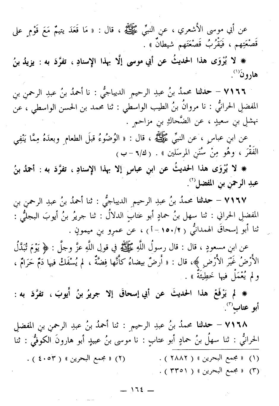 7167 - حَدَّثَنَا مُحَمَّدُ بْنُ عَبْدِ الرَّحِيمِ الدِّيباجِيُّ، ثَنَا أَحْمَدُ بْنُ عَبْدِ الرَّحْمَنِ بْنِ الْمُفَضَّلِ الْحَرَّانِيُّ، ثَنَا سَهْلُ بْنُ حَمَّادٍ أَبُو عَتَّابٍ الدَّلَّالُ، ثَنَا جَرِيرُ بْنُ أَيُّوبَ الْبَجَلِيُّ، ثَنَا أَبُو إِسْحَاقَ الْهَمْدَانِيُّ، عَنْ عَمْرِو بْنِ مَيْمُونٍ، عَنِ ابْنِ مَسْعُودٍ قَالَ: قَالَ رَسُولُ اللَّهِ صَلَّى اللهُ عَلَيْهِ وَسَلَّمَ فِي قَوْلِ اللَّهِ عَزَّ وَجَلَّ: {§يَوْمَ تُبَدَّلُ الْأَرْضُ غَيْرَ الْأَرْضِ} [إبراهيم: 48] قَالَ: «أَرْضٌ بَيْضَاءُ كَأَنَّهَا فِضَّةٌ، لَمْ يُسْفَكْ فِيهَا دَمٌ حَرَامٌ، وَلَمْ يُعْمَلْ فِيهَا خَطِيئَةٌ» لَمْ يَرْفَعْ هَذَا الْحَدِيثَ عَنْ أَبِي إِسْحَاقَ إِلَّا جَرِيرُ بْنُ أَيُّوبَ، تَفَرَّدَ بِهِ: أَبُو عَتَّابٍ "