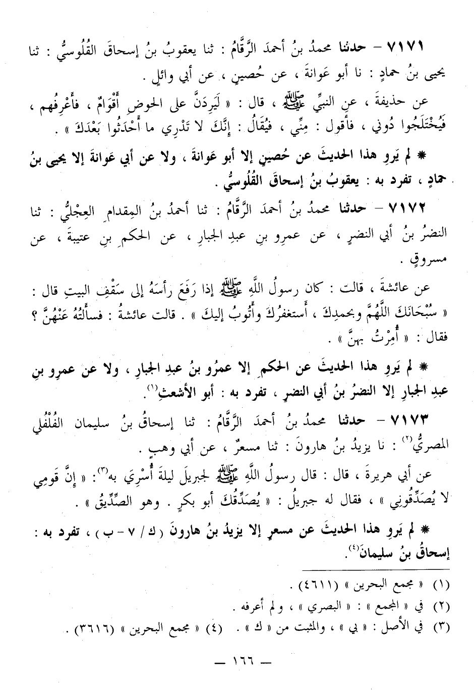 7171 - حَدَّثَنَا مُحَمَّدُ بْنُ أَحْمَدَ الرَّقَّامُ، ثَنَا يَعْقُوبُ بْنُ إِسْحَاقَ الْقُلُوسِيُّ، ثَنَا يَحْيَى بْنُ حَمَّادٍ، نَا أَبُو عَوَانَةَ، عَنْ حُصَيْنٍ، عَنْ أَبِي وَائِلٍ، عَنْ حُذَيْفَةَ، عَنِ النَّبِيِّ صَلَّى اللهُ عَلَيْهِ وَسَلَّمَ قَالَ: «§لَيَرِدَنَّ عَلَى الْحَوْضِ أَقْوَامٌ، فَأَعْرِفُهُمْ، فَيَخْتَلِجُوا دُونِي، فَأَقُولُ: مِنِّي، فَيُقَالُ: إِنَّكَ لَا تَدْرِي مَا أَحْدَثُوا بَعْدَكَ»