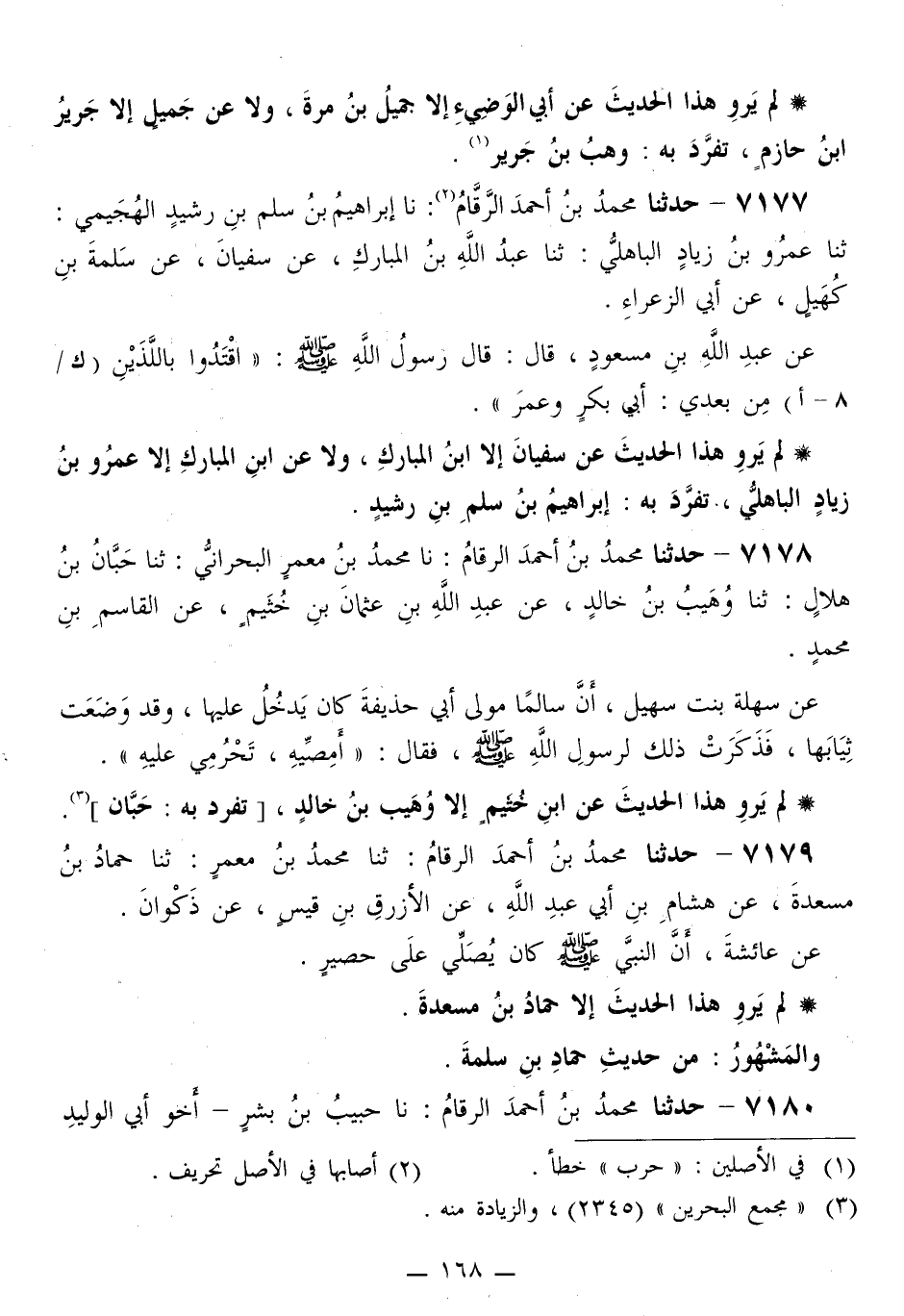 7177 - حَدَّثَنَا مُحَمَّدُ بْنُ أَحْمَدَ الرَّقَّامُ، نَا إِبْرَاهِيمُ بْنُ سَلْمِ بْنِ رُشَيْدٍ الْهُجَيْمِيُّ، ثَنَا عَمْرُو بْنُ زِيَادٍ الْبَاهِلِيُّ، ثَنَا عَبْدُ اللَّهِ بْنُ الْمُبَارَكِ، عَنْ سُفْيَانَ، عَنْ سَلَمَةَ بْنِ كُهَيْلٍ، عَنْ أَبِي الزَّعْرَاءِ، عَنْ عَبْدِ اللَّهِ بْنِ مَسْعُودٍ قَالَ: قَالَ رَسُولُ اللَّهِ صَلَّى اللهُ عَلَيْهِ وَسَلَّمَ: «§اقْتَدُوا بِاللَّذَيْنِ مِنْ بَعْدِي، أَبِي بَكْرٍ، وَعُمَرَ» لَمْ يَرْوَ هَذَا الْحَدِيثَ عَنْ سُفْيَانَ إِلَّا ابْنُ الْمُبَارَكِ، وَلَا عَنِ ابْنِ الْمُبَارَكِ إِلَّا عَمْرُو بْنُ زِيَادٍ الْبَاهِلِيُّ، تَفَرَّدَ بِهِ: إِبْرَاهِيمُ بْنُ سَلْمِ بْنِ رُشَيْدٍ "