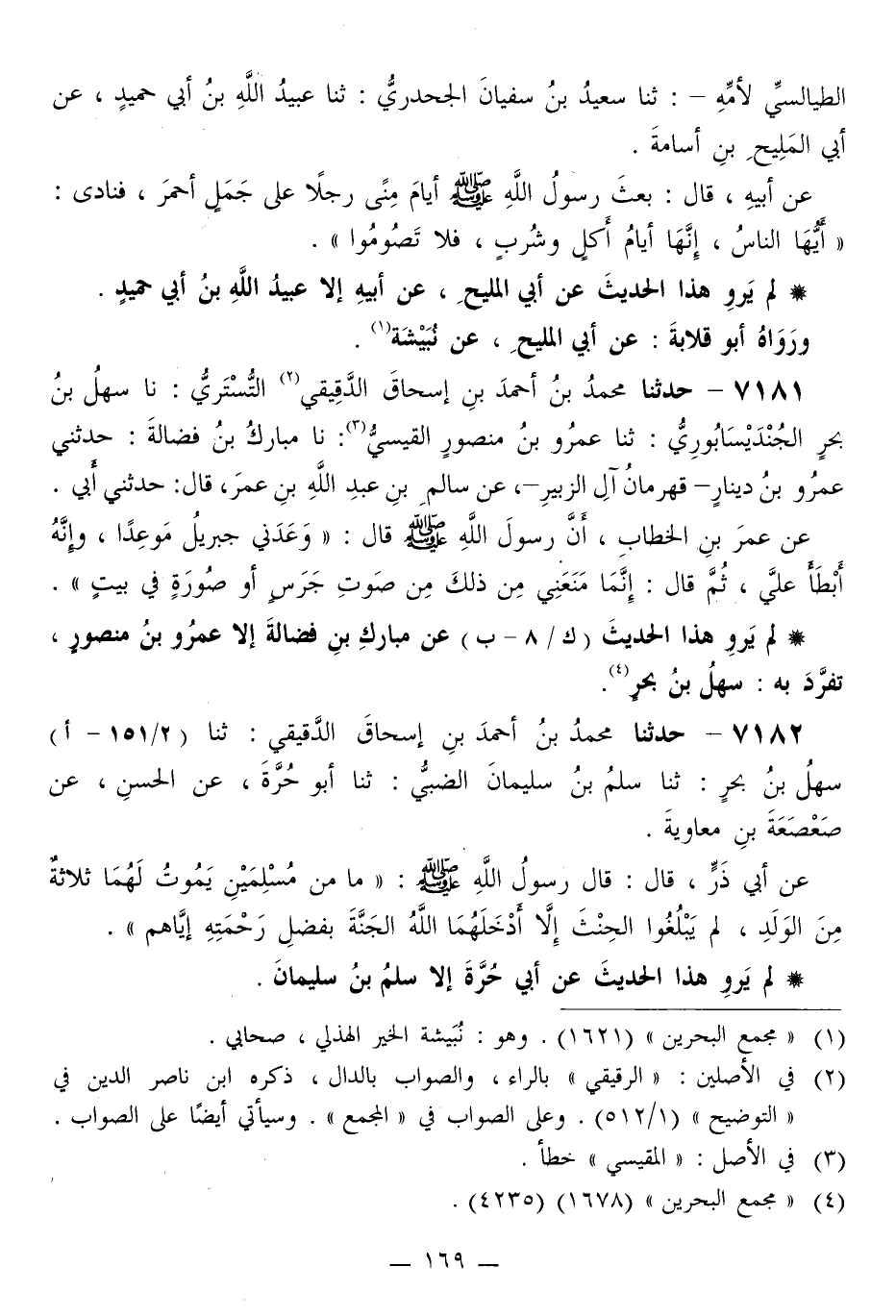 7182 - حَدَّثَنَا مُحَمَّدُ بْنُ أَحْمَدَ بْنِ إِسْحَاقَ الدَّقِيقِيُّ، ثَنَا سَهْلُ بْنُ بَحْرٍ، ثَنَا سَلْمُ بْنُ سُلَيْمَانَ الضَّبِّيُّ، ثَنَا أَبُو حَرَّةَ، عَنِ الْحَسَنِ، عَنْ صَعْصَعَةَ بْنِ مُعَاوِيَةَ، عَنْ أَبِي ذَرٍّ قَالَ: قَالَ رَسُولُ اللَّهِ صَلَّى اللهُ عَلَيْهِ وَسَلَّمَ: «§مَا مِنْ مُسْلِمَيْنِ يَمُوتُ لَهُمَا ثَلَاثَةٌ مِنَ الْوَلَدِ، لَمْ يَبْلُغُوا الْحِنْثَ إِلَّا أَدْخَلَهُمَا اللَّهُ الْجَنَّةَ بِفَضْلِ رَحْمَتِهِ إِيَّاهُمْ»