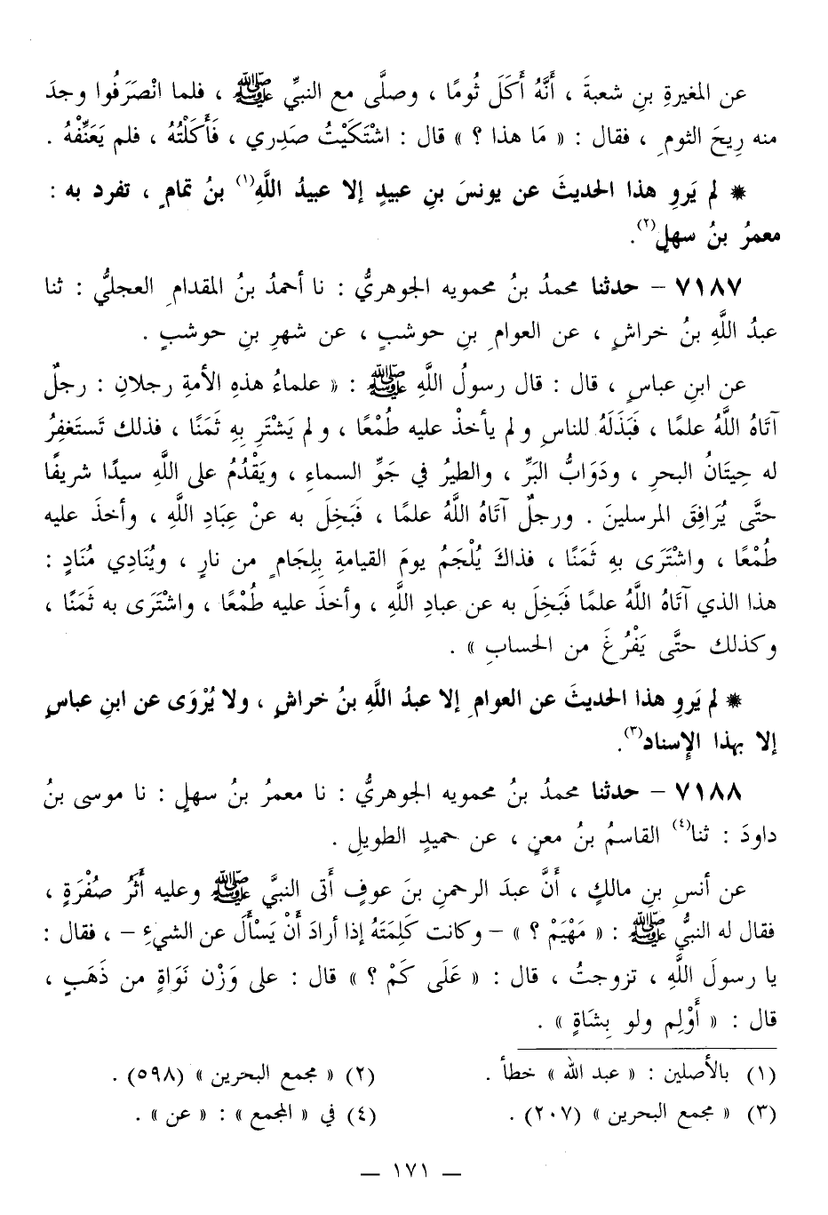 7187 - حَدَّثَنَا مُحَمَّدُ بْنُ مَحْمَوَيْهِ الْجَوْهَرِيُّ، نَا أَحْمَدُ بْنُ الْمِقْدَامِ الْعِجْلِيُّ، ثَنَا عَبْدُ اللَّهِ بْنُ خِرَاشٍ، عَنِ الْعَوَّامِ بْنِ حَوْشَبٍ، عَنْ شَهْرِ بْنِ حَوْشَبٍ، عَنِ ابْنِ عَبَّاسٍ قَالَ: قَالَ رَسُولُ اللَّهِ صَلَّى اللهُ عَلَيْهِ وَسَلَّمَ: «§عُلَمَاءُ هَذِهِ الْأُمَّةِ رَجُلَانِ، رَجُلٌ آتَاهُ اللَّهُ عِلْمًا، فَبَذَلَهُ لِلنَّاسِ وَلَمْ يَأْخُذْ عَلَيْهِ طُمْعًا، وَلَمْ يَشْتَرِ بِهِ ثَمَنًا، فَذَلِكَ تَسْتَغْفِرُ لَهُ حِيتَانُ الْبَحْرِ، وَدَوَابُّ الْبَرِّ، وَالطَّيْرُ فِي جَوِّ السَّمَاءِ، وَيَقْدُمُ عَلَى اللَّهِ سَيِّدًا شَرِيفًا حَتَّى يُرَافِقَ الْمُرْسَلِينَ، وَرَجُلٌ آتَاهُ اللَّهُ عِلْمًا، فَبَخِلَ بِهِ عَنْ عِبَادِ اللَّهِ، وَأَخَذَ عَلَيْهِ طُمْعًا، وَاشْتَرَى بِهِ ثَمَنًا، فَذَاكَ يُلْجَمُ يَوْمَ الْقِيَامَةِ بِلِجَامٍ مِنْ نَارٍ، وَيُنَادِي مُنَادٍ، هَذَا الَّذِي آتَاهُ اللَّهُ عِلْمًا فَبَخِلَ بِهِ عَنْ عِبَادِ اللَّهِ، وَأَخَذَ عَلَيْهِ طُمْعًا، وَاشْتَرَى بِهِ ثَمَنًا، وَكَذَلِكَ حَتَّى يَفْرُغَ مِنَ الْحِسَابِ»