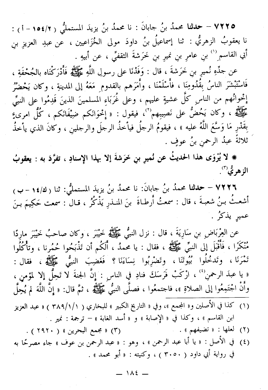 7225 - حَدَّثَنَا مُحَمَّدُ بْنُ جَابَانَ، نَا مُحَمَّدُ بْنُ يَزِيدَ الْمُسْتَمْلِيُّ، نَا يَعْقُوبُ الزُّهْرِيُّ، ثَنَا إِسْمَاعِيلُ بْنُ دَاوُدَ، مَوْلَى الْخُزَاعِيِّينَ، عَنْ عَبْدِ الْعَزِيزِ بْنِ أَبِي الْقَاسِمِ بْنِ عَامِرِ بْنِ نُمَيْرِ بْنِ خَرَشَةَ الثَّقَفِيِّ، عَنْ أَبِيهِ، عَنْ جَدِّهِ نُمَيْرِ بْنِ خَرَشَةَ قَالَ: وَفَدْنَا عَلَى رَسُولِ اللَّهِ صَلَّى اللهُ عَلَيْهِ وَسَلَّمَ فَأَدْرَكْنَاهُ بِالْجُحْفَةِ، فاسْتَبْشَرَ النَّاسُ بِقُدُومِنَا، فَأَسْلَمْنَا، وَأَمَرَهُمْ بِالْقَدُّومِ مَعَهُ إِلَى الْمَدِينَةِ، وَكَانَ يَحْضُرُ إِخْوَانُهُمْ مِنَ النَّاسِ كُلَّ عَشِيَّةٍ عَلَيْهِمْ، وَعَلَى غُرَبَاءِ الْمُسْلِمِينَ الَّذِينَ قَدِمُوا عَلَى النَّبِيِّ صَلَّى اللهُ عَلَيْهِ وَسَلَّمَ، وَكَانَ يَحُضُّ عَلَى تَضْيِفِهِمْ، فَيَقُولُ: «§إِخْوَانَكُمْ ضِيفَانَكُمْ، كُلُّ امْرِئٍ بِقَدْرِ مَا وَسَّعَ اللَّهُ عَلَيْهِ» فَيَقُومُ الرَّجُلُ فَيَأْخُذُ الرَّجُلَ وَالرِّجْلَيْنِ، وَكَانَ الَّذِي يَأْخُذُ ثَلَاثَةً عَبْدَ الرَّحْمَنِ بْنَ عَوْفٍ «