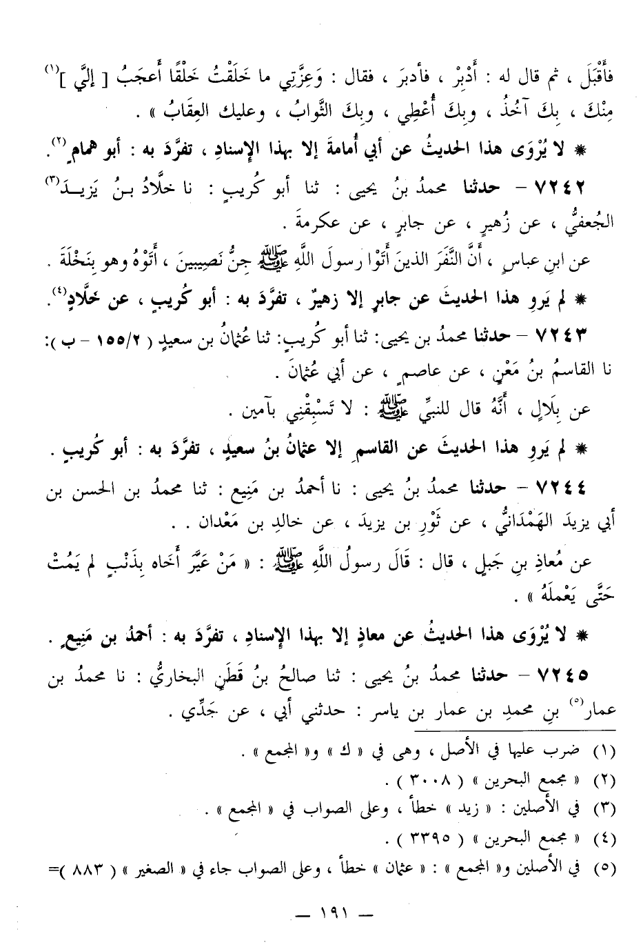7242 - حَدَّثَنَا مُحَمَّدُ بْنُ يَحْيَى، ثَنَا أَبُو كُرَيْبٍ، نَا خَلَّادُ بْنُ يَزِيدَ الْجُعْفِيُّ، عَنْ زُهَيْرٍ، عَنْ جَابِرٍ، عَنْ عِكْرِمَةَ، عَنِ ابْنِ عَبَّاسٍ، «أَنَّ النَّفَرَ §الَّذِينَ أَتَوْا رَسُولَ اللَّهِ صَلَّى اللهُ عَلَيْهِ وَسَلَّمَ جِنُّ نَصِيبِينَ، أَتَوْهُ وَهُوَ بِنَخْلَةَ»
