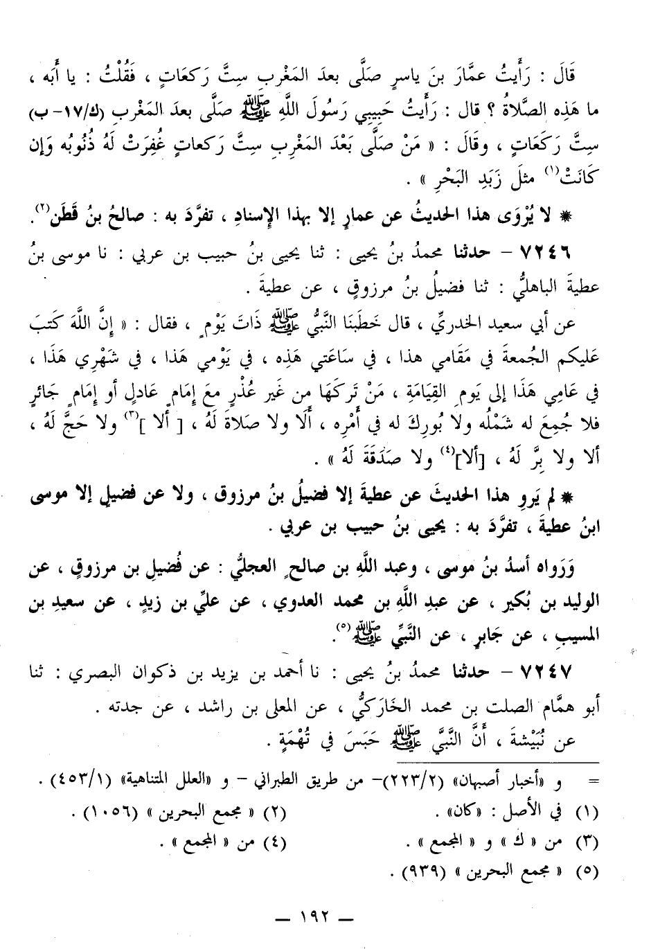 7246 - حَدَّثَنَا مُحَمَّدُ بْنُ يَحْيَى، ثَنَا يَحْيَى بْنُ حَبِيبِ بْنِ عَرَبِيٍّ، نَا مُوسَى بْنُ عَطِيَّةَ الْبَاهِلِيُّ، ثَنَا فُضَيْلُ بْنُ مَرْزُوقٍ، عَنْ عَطِيَّةَ، عَنْ أَبِي سَعِيدٍ الْخُدْرِيِّ قَالَ: خَطَبَنَا النَّبِيُّ صَلَّى اللهُ عَلَيْهِ وَسَلَّمَ ذَاتَ يَوْمٍ، فَقَالَ: «إِنَّ §اللَّهَ كَتَبَ عَلَيْكُمُ الْجُمُعَةَ فِي مَقَامِي هَذَا، فِي سَاعَتِي هَذِهِ، فِي يَوْمِي هَذَا، فِي شَهْرِي هَذَا، فِي عَامِي هَذَا إِلَى يَوْمِ الْقِيَامَةِ، مَنْ تَرَكَهَا مِنْ غَيْرِ عُذْرٍ مَعَ إِمَامٍ عَادِلٍ أَوْ إِمَامٍ جَائِرٍ فَلَا جُمِعَ لَهُ شَمْلُهُ وَلَا بُورِكَ لَهُ فِي أَمْرِهِ، أَلَا وَلَا صَلَاةَ لَهُ، أَلَا وَلَا حَجَّ لَهُ، أَلَا وَلَا بِرَّ لَهُ، أَلَا وَلَا صَدَقَةَ لَهُ»