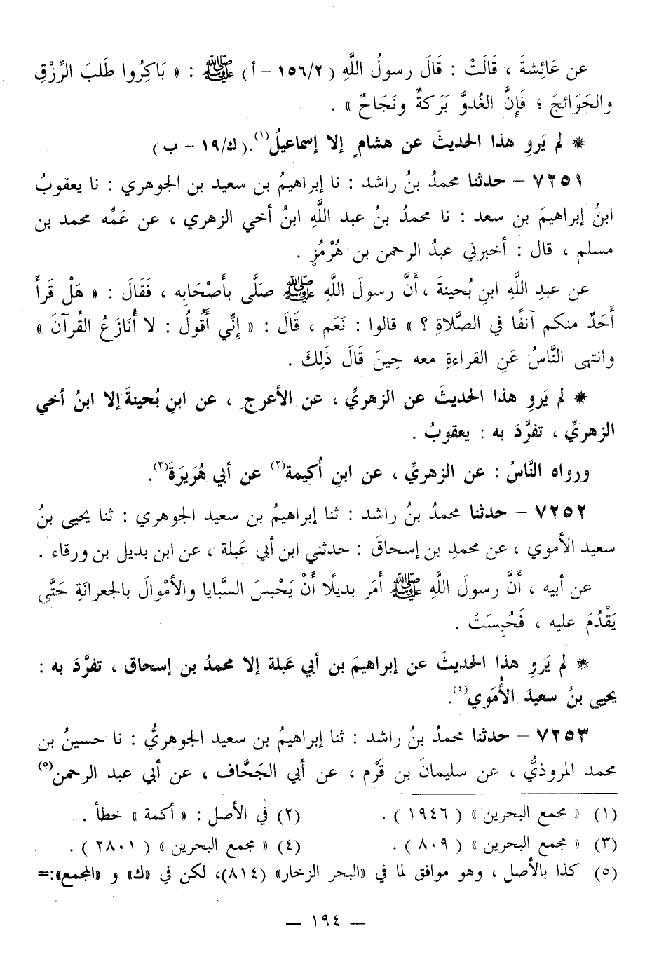 7251 - حَدَّثَنَا مُحَمَّدُ بْنُ رَاشِدٍ، نَا إِبْرَاهِيمُ بْنُ سَعِيدٍ الْجَوْهَرِيُّ، نَا يَعْقُوبُ بْنُ إِبْرَاهِيمَ بْنِ سَعْدٍ، نَا مُحَمَّدُ بْنُ عَبْدِ اللَّهِ ابْنُ أَخِي الزُّهْرِيِّ، عَنْ عَمِّهِ مُحَمَّدِ بْنِ مُسْلِمٍ قَالَ: أَخْبَرَنِي عَبْدُ الرَّحْمَنِ بْنُ هُرْمُزٍ، عَنْ عَبْدِ اللَّهِ بْنِ بُحَيْنَةَ، أَنَّ رَسُولَ اللَّهِ صَلَّى اللهُ عَلَيْهِ وَسَلَّمَ صَلَّى بِأَصْحَابِهِ، فَقَالَ: «هَلْ قَرَأَ أَحَدٌ مِنْكُمْ آنِفًا فِي الصَّلَاةِ؟» قَالُوا: نَعَمْ قَالَ: «§إِنِّي أَقُولُ: لَا أُنَازَعُ الْقُرْآنَ» وَانْتَهَى النَّاسُ عَنِ الْقِرَاءَةِ مَعَهُ حِينَ قَالَ ذَلِكَ «