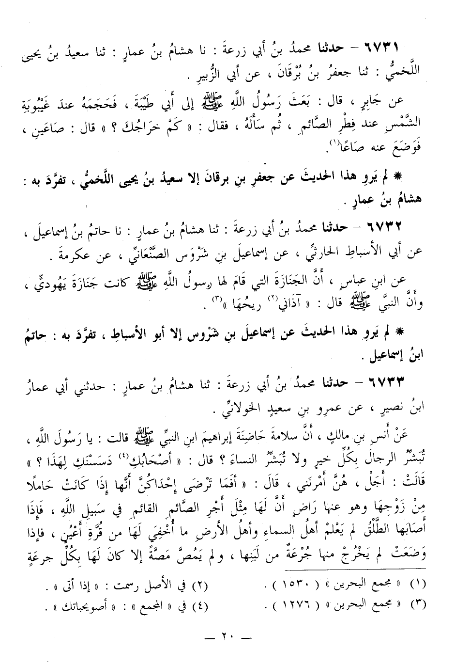 6731 - حَدَّثَنَا مُحَمَّدُ بْنُ أَبِي زُرْعَةَ، نَا هِشَامُ بْنُ عَمَّارٍ، ثَنَا سَعِيدُ بْنُ يَحْيَى اللَّخْمِيُّ، ثَنَا جَعْفَرُ بْنُ بُرْقَانَ، عَنْ أَبِي الزُّبَيْرِ، عَنْ جَابِرٍ قَالَ: بَعَثَ رَسُولُ اللَّهِ صَلَّى اللهُ عَلَيْهِ وَسَلَّمَ إِلَى أَبِي طَيْبَةَ فَحَجَمَهُ عِنْدَ غَيْبُوبَةِ الشَّمْسِ عِنْدَ فِطْرِ الصَّائِمِ، ثُمَّ سَأَلَهُ، فَقَالَ: «§كَمْ خَرَاجُكَ؟» قَالَ: صَاعَيْنِ، فَوَضَعَ عَنْهُ صاعًا «