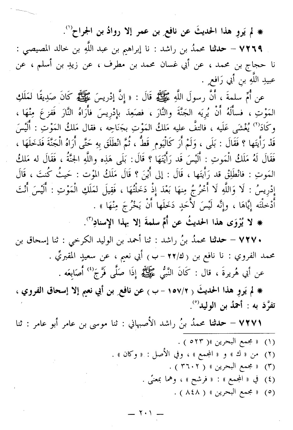 7269 - حَدَّثَنَا مُحَمَّدُ بْنُ رَاشِدٍ، نَا إِبْرَاهِيمُ بْنُ عَبْدِ اللَّهِ بْنِ خَالِدٍ الْمِصِّيصِيُّ، نَا حَجَّاجُ بْنُ مُحَمَّدٍ، عَنْ أَبِي غَسَّانَ مُحَمَّدِ بْنِ مُطَرِّفٍ، عَنْ زَيْدِ بْنِ أَسْلَمَ، عَنْ عُبَيْدِ اللَّهِ بْنِ أَبِي رَافِعٍ، عَنْ أُمِّ سَلَمَةَ، أَنَّ رَسُولَ اللَّهِ صَلَّى اللهُ عَلَيْهِ وَسَلَّمَ قَالَ: «إِنَّ §إِدْرِيسَ صَلَّى اللهُ عَلَيْهِ وَسَلَّمَ كَانَ صَدِيقًا لِمَلَكِ الْمَوْتِ، فَسَأَلَهُ أَنْ يُرِيَهَ الْجَنَّةَ وَالنَّارَ، فَصَعِدَ بِإِدْرِيسَ فَأَرَاهُ النَّارَ فَفَزِعَ مِنْهَا، وَكَادَ يُغْشَى عَلَيْهِ، فَالْتَفَّ عَلَيْهِ مَلَكُ الْمَوْتِ بِجَنَاحِهِ، فَقَالَ مَلَكُ الْمَوْتِ: أَلَيْسَ قَدْ رَأَيْتَهَا؟ فَقَالَ: بَلَى، وَلَمْ أَرَ كَالْيَوْمِ قَطُّ، ثُمَّ انْطَلَقَ بِهِ حَتَّى أَرَاهُ الْجَنَّةَ فَدَخَلَهَا، فَقَالَ لَهُ مَلَكُ الْمَوْتِ: أَلَيْسَ قَدْ رَأَيْتَهَا؟ قَالَ: بَلَى، هَذِهِ وَاللَّهِ الْجَنَّةُ، فَقَالَ لَهُ مَلَكُ الْمَوْتِ: فَانْطَلِقْ قَدْ رَأَيْتَهَا قَالَ: إِلَى أَيْنَ؟ قَالَ مَلَكُ الْمَوْتِ: حَيْثُ كُنْتَ، قَالَ إِدْرِيسُ: لَا وَاللَّهِ لَا أَخْرُجُ مِنْهَا بَعْدَ إِذْ دَخَلْتُهَا، فَقِيلَ لِمَلَكِ الْمَوْتِ: أَلَيْسَ أَنْتَ أَدْخَلْتَهُ إِيَّاهَا، وَإِنَّهُ لَيْسَ لِأَحَدٍ دَخَلَهَا أَنْ يَخْرُجَ مِنْهَا»