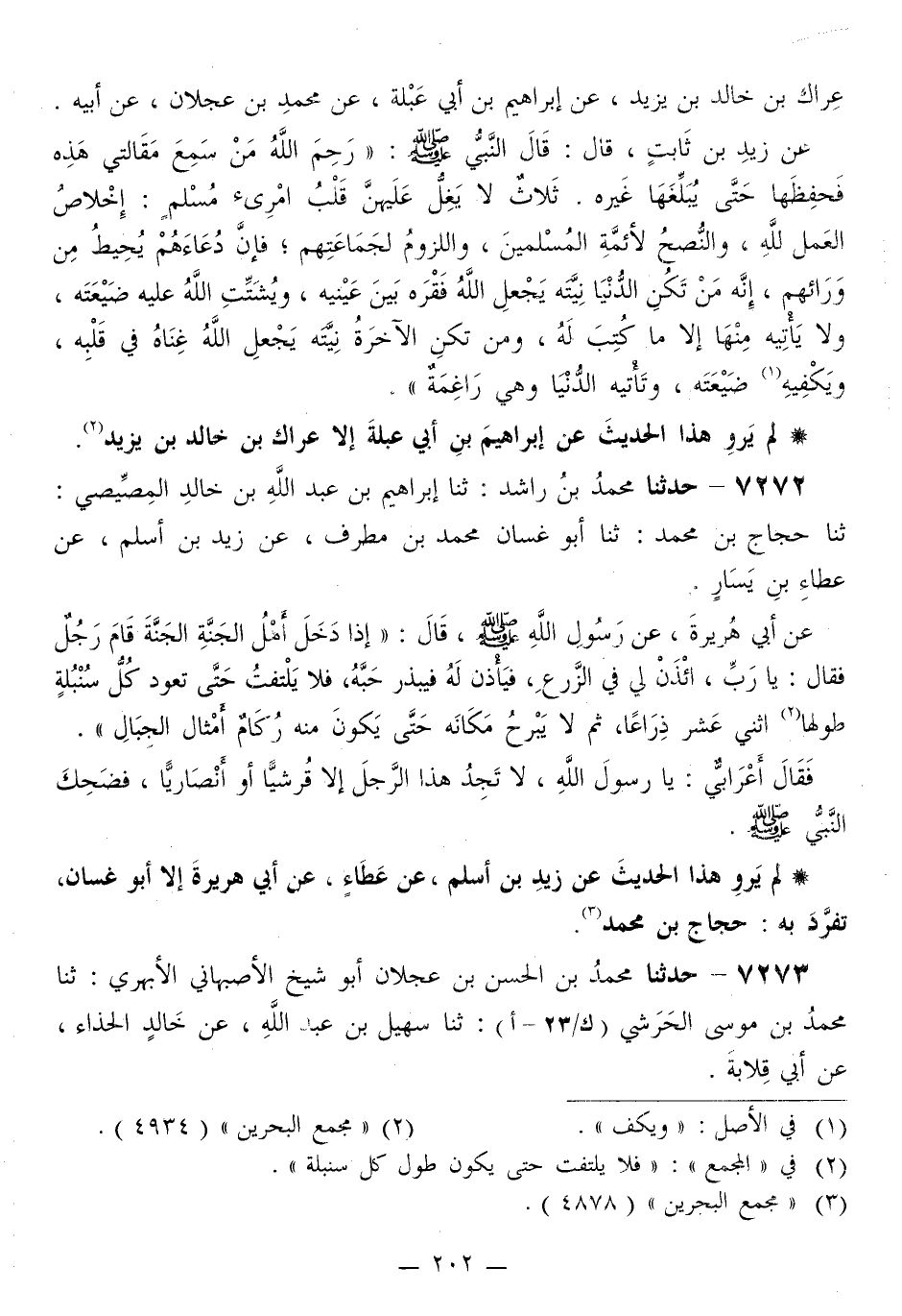 7272 - حَدَّثَنَا مُحَمَّدُ بْنُ رَاشِدٍ، ثَنَا إِبْرَاهِيمُ بْنُ عَبْدِ اللَّهِ بْنِ خَالِدٍ الْمِصِّيصِيُّ، ثَنَا حَجَّاجُ بْنُ مُحَمَّدٍ، ثَنَا أَبُو غَسَّانَ مُحَمَّدُ بْنُ مُطَرِّفٍ، عَنْ زَيْدِ بْنِ أَسْلَمَ، عَنْ عَطَاءِ بْنِ يَسَارٍ، عَنْ أَبِي هُرَيْرَةَ، عَنْ رَسُولِ اللَّهِ صَلَّى اللهُ عَلَيْهِ وَسَلَّمَ قَالَ: «§إِذَا دَخَلَ أَهْلُ الْجَنَّةِ الْجَنَّةَ قَامَ رَجُلٌ فَقَالَ: يَا رَبِّ، ائْذَنْ لِي فِي الزَّرْعِ، فَيَأْذَنُ لَهُ فَيَبْذُرُ حَبَّهُ، فَلَا يَلْتَفِتُ حَتَّى يَكُونَ طُولُ كُلِّ سُنْبُلَةٍ اثْنَيْ عَشَرَ ذِرَاعًا، ثُمَّ لَا يَبْرَحُ مَكَانَهُ حَتَّى يَكُونَ مِنْهُ ركامٌ أَمْثَالُ الْجِبَالِ» فَقَالَ أَعْرَابِيٌّ: يَا رَسُولَ اللَّهِ، لَا تَجِدُ هَذَا الرَّجُلَ إِلَّا قُرَشِيًّا أَوْ أَنْصَارِيًّا، فَضَحِكَ النَّبِيُّ صَلَّى اللهُ عَلَيْهِ وَسَلَّمَ «