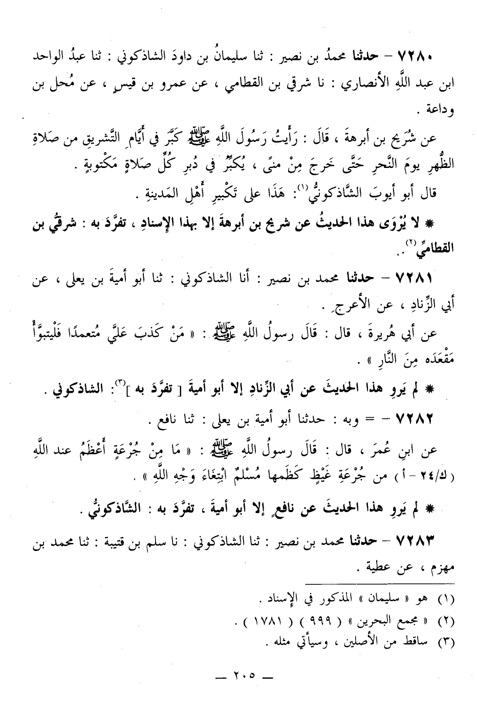7281 - حَدَّثَنَا مُحَمَّدُ بْنُ نُصَيْرٍ، أَنَا الشَّاذَكُونِيُّ، ثَنَا أَبُو أُمَيَّةَ بْنُ يَعْلَى، عَنْ أَبِي الزِّنَادِ، عَنِ الْأَعْرَجِ، عَنْ أَبِي هُرَيْرَةَ قَالَ: قَالَ رَسُولُ اللَّهِ صَلَّى اللهُ عَلَيْهِ وَسَلَّمَ: «§مَنْ كَذَبَ عَلَيَّ مُتَعَمِّدًا فَلْيَتَبَوَّأْ مَقْعَدَهُ مِنَ النَّارِ»