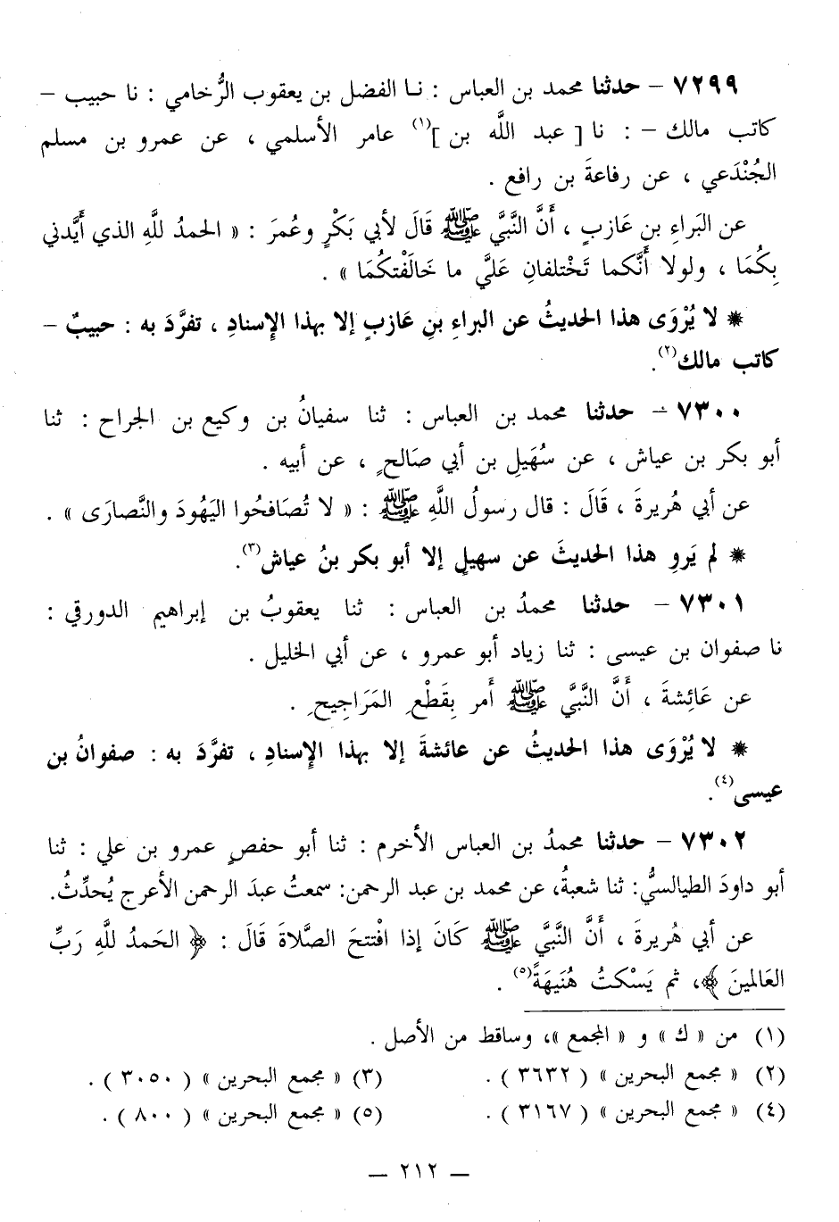 7302 - حَدَّثَنَا مُحَمَّدُ بْنُ الْعَبَّاسِ الْأَخْرَمُ، ثَنَا أَبُو حَفْصٍ عَمْرُو بْنُ عَلِيٍّ، ثَنَا أَبُو دَاوُدَ الطَّيَالِسِيُّ، ثَنَا شُعْبَةُ، عَنْ مُحَمَّدِ بْنِ عَبْدِ الرَّحْمَنِ، سَمِعْتُ عَبْدَ الرَّحْمَنِ الْأَعْرَجَ، يُحَدِّثُ عَنْ أَبِي هُرَيْرَةَ، «أَنَّ النَّبِيَّ صَلَّى اللهُ عَلَيْهِ وَسَلَّمَ كَانَ §إِذَا افْتَتَحَ الصَّلَاةَ قَالَ: {الْحَمْدُ لِلَّهِ رَبِّ الْعَالَمِينَ} [الفاتحة: 2] ثُمَّ يَسْكُتُ هُنَيْهَةً» -[213]- لَمْ يَرْوِ هَذَا الْحَدِيثَ عَنْ شُعْبَةَ إِلَّا أَبُو دَاوُدَ "