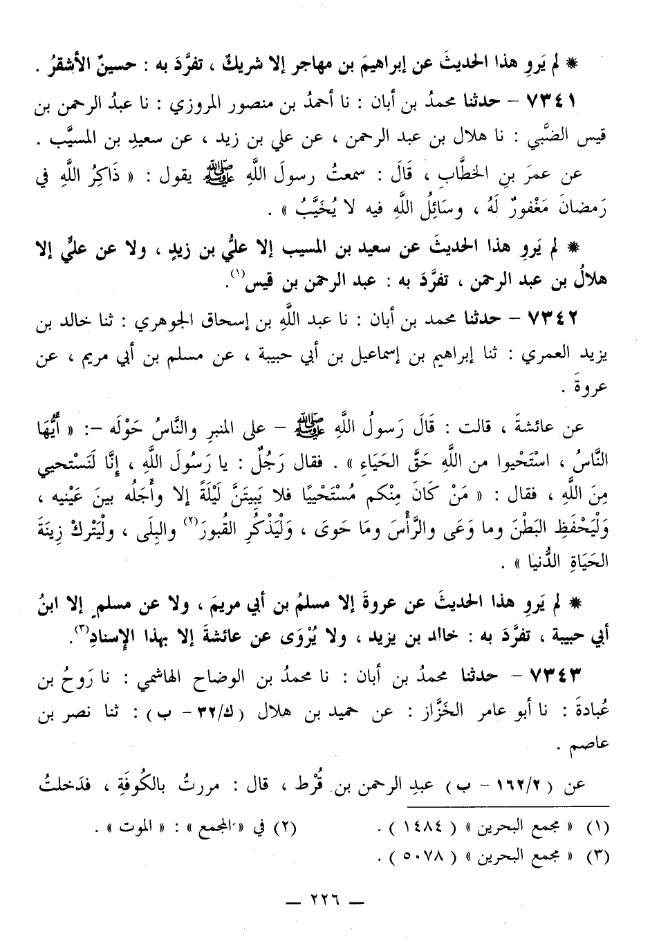 7342 - حَدَّثَنَا مُحَمَّدُ بْنُ أَبَانَ، نَا عَبْدُ اللَّهِ بْنُ إِسْحَاقَ الْجَوْهَرِيُّ، ثَنَا خَالِدُ بْنُ يَزِيدَ الْعُمَرِيُّ، ثَنَا إِبْرَاهِيمُ بْنُ إِسْمَاعِيلَ بْنِ أَبِي حَبِيبَةَ، عَنْ مُسْلِمِ بْنِ أَبِي مَرْيَمَ، عَنْ عُرْوَةَ، عَنْ عَائِشَةَ، قَالَتْ: قَالَ رَسُولُ اللَّهِ صَلَّى اللهُ عَلَيْهِ وَسَلَّمَ عَلَى الْمِنْبَرِ وَالنَّاسُ حَوْلَهُ: «أَيُّهَا النَّاسُ، §اسْتَحْيُوا مِنَ اللَّهِ حَقَّ الْحَيَاءِ» فَقَالَ رَجُلٌ: يَا رَسُولَ اللَّهِ، إِنَّا لَنَسْتَحْيِي مِنَ اللَّهِ، فَقَالَ: «مَنْ كَانَ مِنْكُمْ مُسْتَحْيِيًا فَلَا يَبِيتَنَّ لَيْلَةً إِلَّا وَأَجَلُهُ بَيْنَ عَيْنَيْهِ، وَلْيَحْفَظِ الْبَطْنَ وَمَا وَعَى وَالرَّأْسَ وَمَا حَوَى، وَلْيَذْكُرِ الْقُبُورَ وَالْبِلَى، وَلْيَتْرُكْ زِينَةَ الْحَيَاةِ الدُّنْيَا»