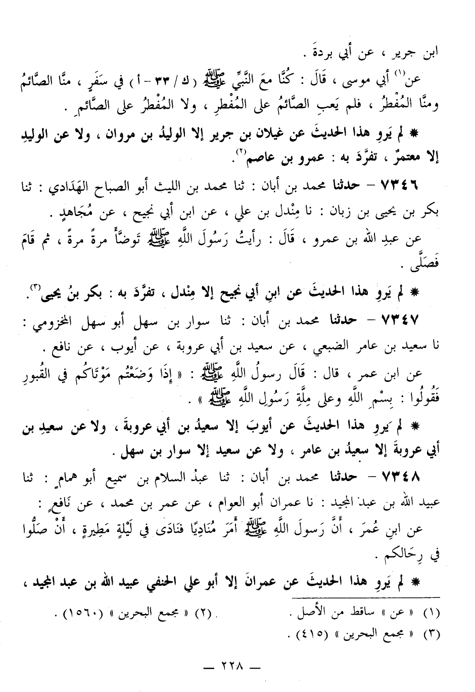 7347 - حَدَّثَنَا مُحَمَّدُ بْنُ أَبَانَ، ثَنَا سَوَّارُ بْنُ سَهْلٍ أَبُو سَهْلٍ الْمَخْزُومِيُّ، نَا سَعِيدُ بْنُ عَامِرٍ الضُّبَعِيُّ، عَنْ سَعِيدِ بْنِ أَبِي عَرُوبَةَ، عَنْ أَيُّوبَ، عَنْ نَافِعٍ، عَنِ ابْنِ عُمَرَ قَالَ: قَالَ رَسُولُ اللَّهِ صَلَّى اللهُ عَلَيْهِ وَسَلَّمَ: «§إِذَا وَضَعْتُمْ مَوْتَاكُمْ فِي الْقُبُورِ فَقُولُوا: بِسْمِ اللَّهِ وَعَلَى مِلَّةِ رَسُولِ اللَّهِ صَلَّى اللهُ عَلَيْهِ وَسَلَّمَ»