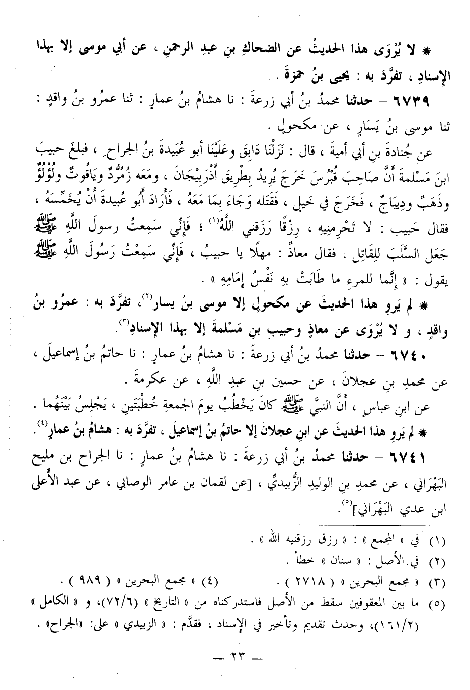 6739 - حَدَّثَنَا مُحَمَّدُ بْنُ أَبِي زُرْعَةَ، نَا هِشَامُ بْنُ عَمَّارٍ، ثَنَا عَمْرُو بْنُ وَاقِدٍ، ثَنَا مُوسَى بْنُ يَسَارٍ، عَنْ مَكْحُولٍ، عَنْ جُنَادَةَ بْنِ أَبِي أُمَيَّةَ قَالَ: نَزَلْنَا دابِقَ وَعَلَيْنَا أَبُو عُبَيْدَةَ بْنُ الْجَرَّاحِ، فَبَلَغَ حَبِيبَ بْنَ مَسْلَمَةَ أَنَّ صَاحِبَ قُبْرُسَ خَرَجَ يُرِيدُ بِطْرِيقَ أَذْرِبِيجانَ، وَمَعَهُ زُمُرُّدٌ وَيَاقُوتٌ ولُؤْلُؤٌ وَذَهَبٌ وديباجٌ، فَخَرَجَ فِي خَيْلٍ، فَقَتَلَهُ وَجَاءَ بِمَا مَعَهُ، فَأَرَادَ أَبُوعُبَيْدَةَ أَنْ يُخَمِّسَهُ، فَقَالَ حَبِيبٌ: لَا تَحْرِمْنِيهِ، رِزْقًا رَزَقَنِي اللَّهُ، فَإِنِّي سَمِعْتُ رَسُولَ اللَّهِ صَلَّى اللهُ عَلَيْهِ وَسَلَّمَ جَعَلَ السَّلَبَ لِلْقَاتِلِ. فَقَالَ مُعَاذٌ: مَهْلًا يَا حَبِيبُ، فَإِنِّي سَمِعْتُ رَسُولَ اللَّهِ صَلَّى اللهُ عَلَيْهِ وَسَلَّمَ يَقُولُ: «§إِنَّمَا لِلْمَرْءِ مَا طَابَتْ بِهِ نَفْسُ إِمَامِهِ»