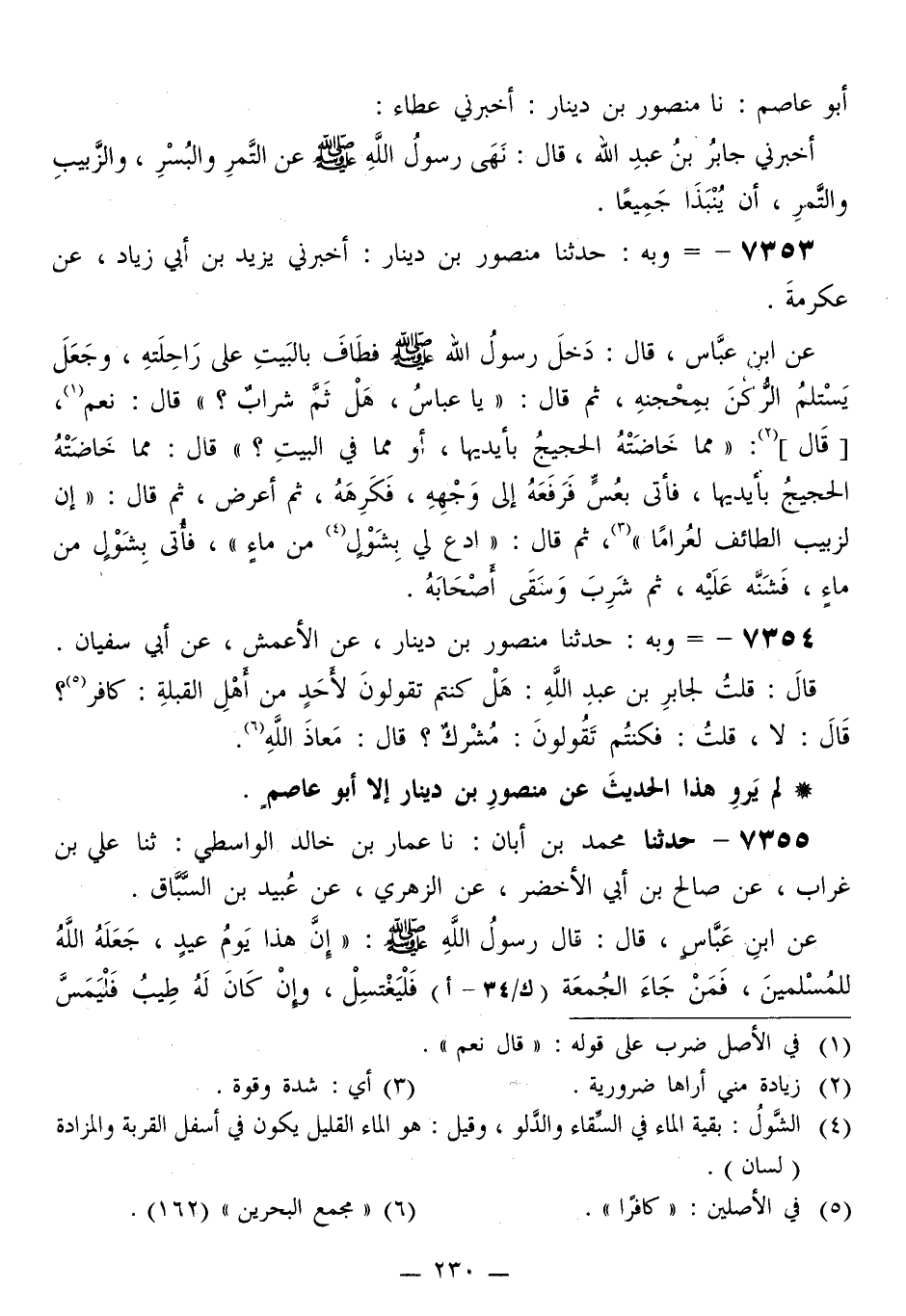 7353 - وَبِهِ: حَدَّثَنَا مَنْصُورُ بْنُ دِينَارٍ، أَخْبَرَنِي يَزِيدُ بْنُ أَبِي زِيَادٍ، عَنْ عِكْرِمَةَ، عَنِ ابْنِ عَبَّاسٍ قَالَ: دَخَلَ رَسُولُ اللَّهِ صَلَّى اللهُ عَلَيْهِ وَسَلَّمَ فَطَافَ بِالْبَيْتِ عَلَى رَاحِلَتِهِ، وَجَعَلَ يَسْتَلِمُ الرُّكْنَ بِمِحْجَنِهِ، ثُمَّ قَالَ: «يَا عَبَّاسُ، §هَلْ ثَمَّ شَرَابٌ؟» قَالَ: نَعَمْ قَالَ: «مِمَّا خاضَتْهُ الْحَجِيجُ بِأَيْدِيهَا، أَوْ مِمَّا فِي الْبَيْتِ؟» قَالَ: مِمَّا خاضَتْهُ الْحَجِيجُ بِأَيْدِيهَا، فَأُتِيَ بِعُسٍّ فَرَفَعَهُ إِلَى وَجْهِهِ، فَكَرِهَهُ، ثُمَّ أَعْرَضَ، ثُمَّ قَالَ: «إِنَّ لِزَبِيبِ الطَّائِفِ لَعُرَامًا» ، ثُمَّ قَالَ: «ادْعُ لِي بِشَوْلٍ مِنْ مَاءٍ» ، فَأُتِيَ بِشَوْلٍ مِنْ مَاءٍ، فَشَنَّهُ عَلَيْهِ، ثُمَّ شَرِبَ وَسَقَى أَصْحَابَهُ