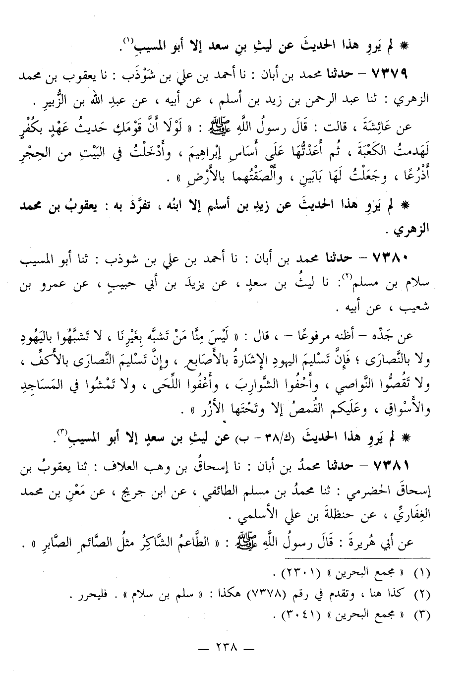 7379 - حَدَّثَنَا مُحَمَّدُ بْنُ أَبَانَ، نَا أَحْمَدُ بْنُ عَلِيِّ بْنِ شَوْذَبٍ، نَا يَعْقُوبُ بْنُ مُحَمَّدٍ الزُّهْرِيُّ، ثَنَا عَبْدُ الرَّحْمَنِ بْنُ زَيْدِ بْنِ أَسْلَمَ، عَنْ أَبِيهِ، عَنْ عَبْدِ اللَّهِ بْنِ الزُّبَيْرِ، عَنْ عَائِشَةَ، قَالَتْ: قَالَ رَسُولُ اللَّهِ صَلَّى اللهُ عَلَيْهِ وَسَلَّمَ: «§لَوْلَا أَنَّ قَوْمَكِ حَدِيثُ عَهْدٍ بِكُفْرٍ لَهَدَمْتُ الْكَعْبَةَ، ثُمَّ أَعَدْتُها عَلَى أَسَاسِ إِبْرَاهِيمَ، وَأَدْخَلْتُ فِي الْبَيْتِ مِنَ الْحِجْرِ أَذْرُعًا، وَجَعَلْتُ لَهَا بَابَيْنِ، وأَلْصَقْتُهُما بِالْأَرْضِ»