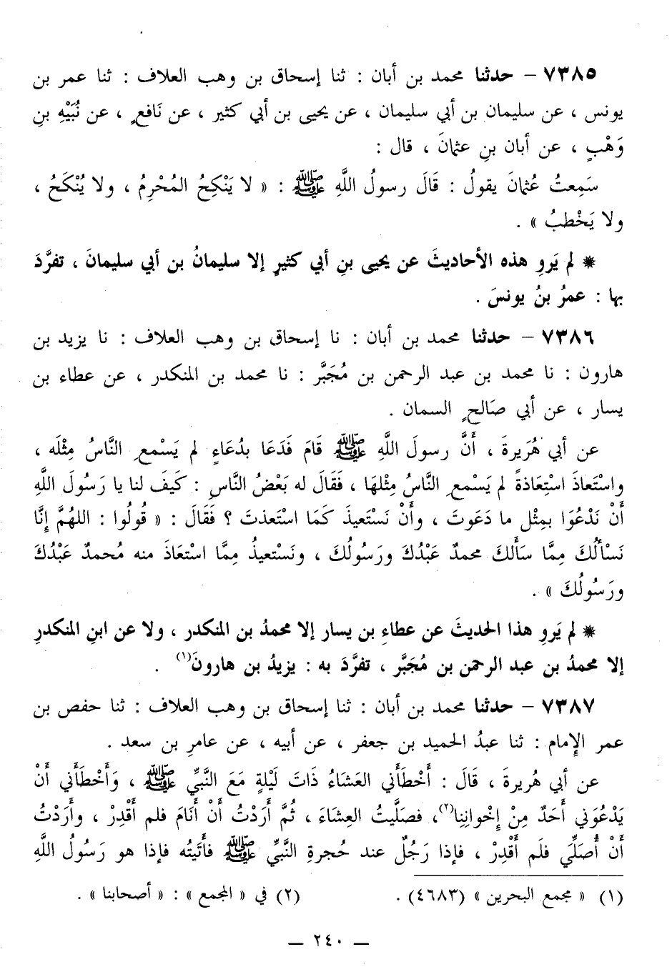 7385 - حَدَّثَنَا مُحَمَّدُ بْنُ أَبَانَ، ثَنَا إِسْحَاقُ بْنُ وَهْبٍ الْعَلَّافُ، ثَنَا عُمَرُ بْنُ يُونُسَ، عَنْ سُلَيْمَانَ بْنِ أَبِي سُلَيْمَانَ، عَنْ يَحْيَى بْنِ أَبِي كَثِيرٍ، عَنْ نَافِعٍ، عَنْ نُبَيْهِ بْنِ وَهْبٍ، عَنْ أَبَانَ بْنِ عُثْمَانَ قَالَ: سَمِعْتُ عُثْمَانَ، يَقُولُ: قَالَ رَسُولُ اللَّهِ صَلَّى اللهُ عَلَيْهِ وَسَلَّمَ: «§لَا يَنْكِحِ الْمُحْرِمُ، وَلَا يُنْكَحْ، وَلَا يَخْطُبْ»