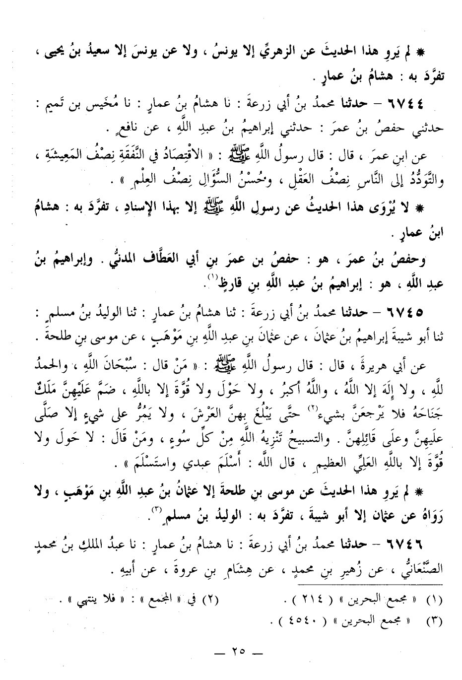 6745 - حَدَّثَنَا مُحَمَّدُ بْنُ أَبِي زُرْعَةَ، ثَنَا هِشَامُ بْنُ عَمَّارٍ، ثَنَا الْوَلِيدُ بْنُ مُسْلِمٍ، ثَنَا أَبُو شَيْبَةَ إِبْرَاهِيمُ بْنُ عُثْمَانَ، عَنْ عُثْمَانَ بْنِ عَبْدِ اللَّهِ بْنِ مَوْهَبٍ، عَنْ مُوسَى بْنِ طَلْحَةَ، عَنْ أَبِي هُرَيْرَةَ قَالَ: قَالَ رَسُولُ اللَّهِ صَلَّى اللهُ عَلَيْهِ وَسَلَّمَ: «§مَنْ قَالَ: سُبْحَانَ اللَّهِ، وَالْحَمْدُ لِلَّهِ، وَلَا إِلَهَ إِلَّا اللَّهُ، وَاللَّهُ أَكْبَرُ، وَلَا حَوْلَ وَلَا قُوَّةَ إِلَّا بِاللَّهِ، ضَمَّ عَلَيْهِنَّ مَلَكٌ جَنَاحَهُ فَلَا يَرْجِعَنَّ بِشَيْءٍ حَتَّى يَبْلُغَ بِهِنَّ الْعَرْشَ، وَلَا يَمُرُّ عَلَى شَيْءٍ إِلَّا صَلَّى عَلَيْهِنَّ وَعَلَى قَائِلِهِنَّ. وَالتَّسْبِيحُ تَنْزِيهُ اللَّهِ مِنْ كُلِّ سُوءٍ»