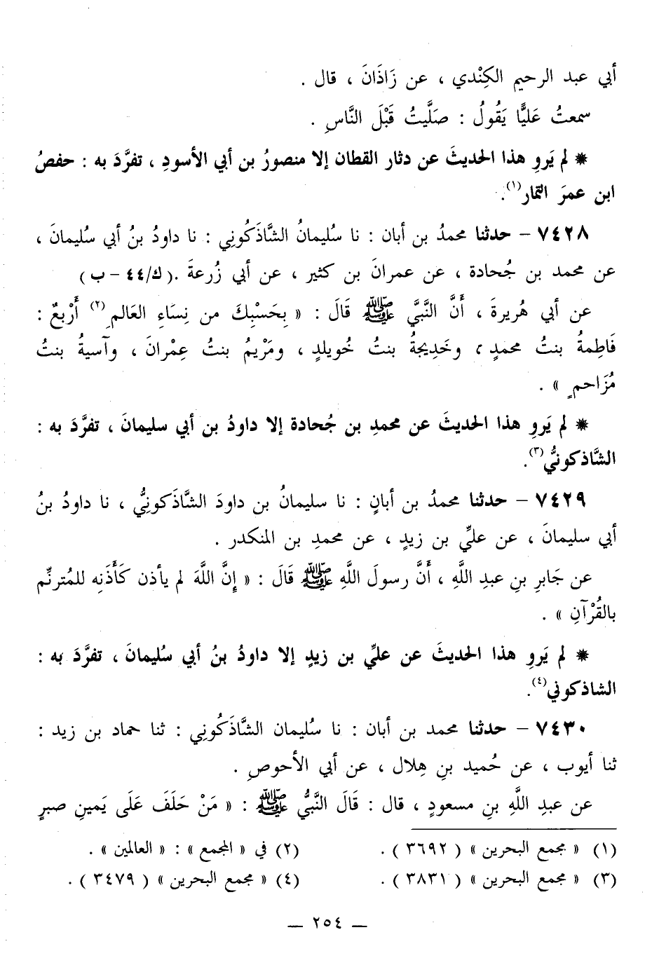 7428 - حَدَّثَنَا مُحَمَّدُ بْنُ أَبَانَ، نَا سُلَيْمَانُ الشَّاذَكُونِيُّ، نَا دَاوُدُ بْنُ أَبِي سُلَيْمَانَ، عَنْ مُحَمَّدِ بْنِ جُحَادَةَ، عَنْ عِمْرَانَ بْنِ كَثِيرٍ، عَنْ أَبِي زُرْعَةَ، عَنْ أَبِي هُرَيْرَةَ، أَنَّ النَّبِيَّ صَلَّى اللهُ عَلَيْهِ وَسَلَّمَ قَالَ: «§بِحَسْبِكَ مِنْ نِسَاءِ الْعَالِمِ أَرْبَعٌ: فَاطِمَةُ بِنْتُ مُحَمَّدٍ، وَخَدِيجَةُ بِنْتُ خُوَيْلِدٍ، وَمَرْيَمُ بِنْتُ عِمْرَانَ، وَآسِيَةُ بِنْتُ مُزَاحِمٍ»