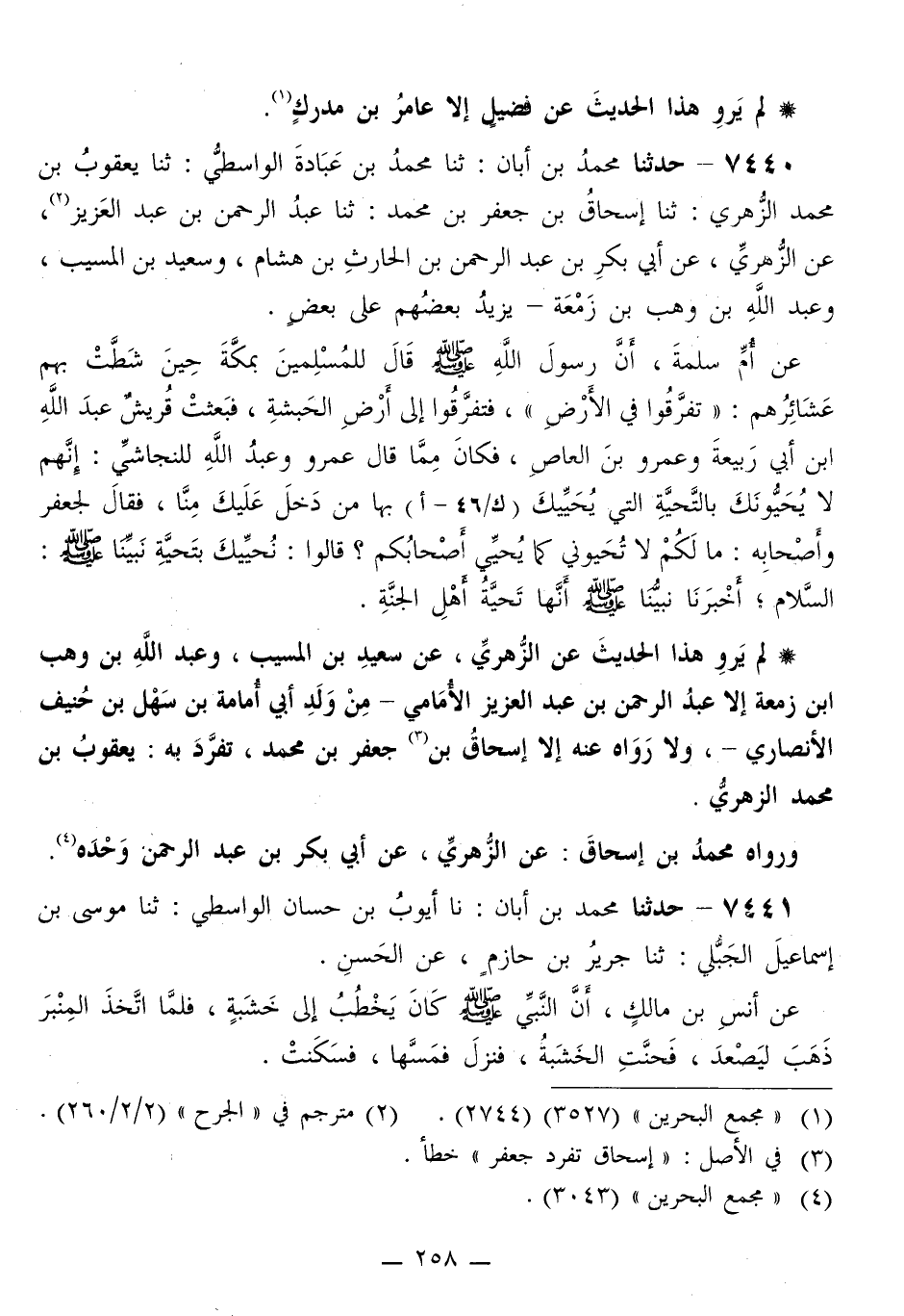 7440 - حَدَّثَنَا مُحَمَّدُ بْنُ أَبَانَ، ثَنَا مُحَمَّدُ بْنُ عُبَادَةَ الْوَاسِطِيُّ، ثَنَا يَعْقُوبُ بْنُ مُحَمَّدٍ الزُّهْرِيُّ، ثَنَا إِسْحَاقُ بْنُ جَعْفَرِ بْنِ مُحَمَّدٍ، ثَنَا عَبْدُ الرَّحْمَنِ بْنُ عَبْدِ الْعَزِيزِ، عَنِ الزُّهْرِيِّ، عَنْ أَبِي بَكْرِ بْنِ عَبْدِ الرَّحْمَنِ بْنِ الْحَارِثِ بْنِ هِشَامٍ، وَسَعِيدِ بْنِ الْمُسَيِّبِ، وَعَبْدِ اللَّهِ بْنِ وَهْبِ بْنِ زَمْعَةَ، يَزِيدُ بَعْضُهُمْ عَلَى بَعْضٍ عَنْ أُمِّ سَلَمَةَ، أَنَّ رَسُولَ اللَّهِ صَلَّى اللهُ عَلَيْهِ وَسَلَّمَ قَالَ لِلْمُسْلِمِينَ بِمَكَّةَ حِينَ شَطَّتْ بِهِمْ عَشَائِرُهُمْ: «تَفَرَّقُوا فِي الْأَرْضِ» ، فَتَفَرَّقُوا إِلَى أَرْضٍ الْحَبَشَةِ، فَبَعَثَتْ قُرَيْشٌ عَبْدَ اللَّهِ بْنَ أَبِي رَبِيعَةَ، وَعَمْرَو بْنَ الْعَاصِ، فَكَانَ مِمَّا قَالَ عَمْرٌو وَعَبْدُ اللَّهِ لِلنَّجَاشِيُّ: إِنَّهُمْ لَا يُحَيُّونَكَ بِالتَّحِيَّةِ الَّتِي يُحَيِّيكَ بِهَا مَنْ دَخَلَ عَلَيْكَ مِنَّا، فَقَالَ لِجَعْفَرٍ، وَأَصْحَابِهِ: مَا لَكُمْ لَا تُحَيُّونِي كَمَا يُحَيِّي أَصْحَابُكُمْ؟ قَالُوا: «§نُحَيِّيكَ بِتَحِيَّةِ نَبِيِّنَا صَلَّى اللهُ عَلَيْهِ وَسَلَّمَ: السَّلَامُ، أَخْبَرَنَا نَبِيُّنَا صَلَّى اللهُ عَلَيْهِ وَسَلَّمَ أَنَّهَا تَحِيَّةُ أَهْلِ الْجَنَّةِ»