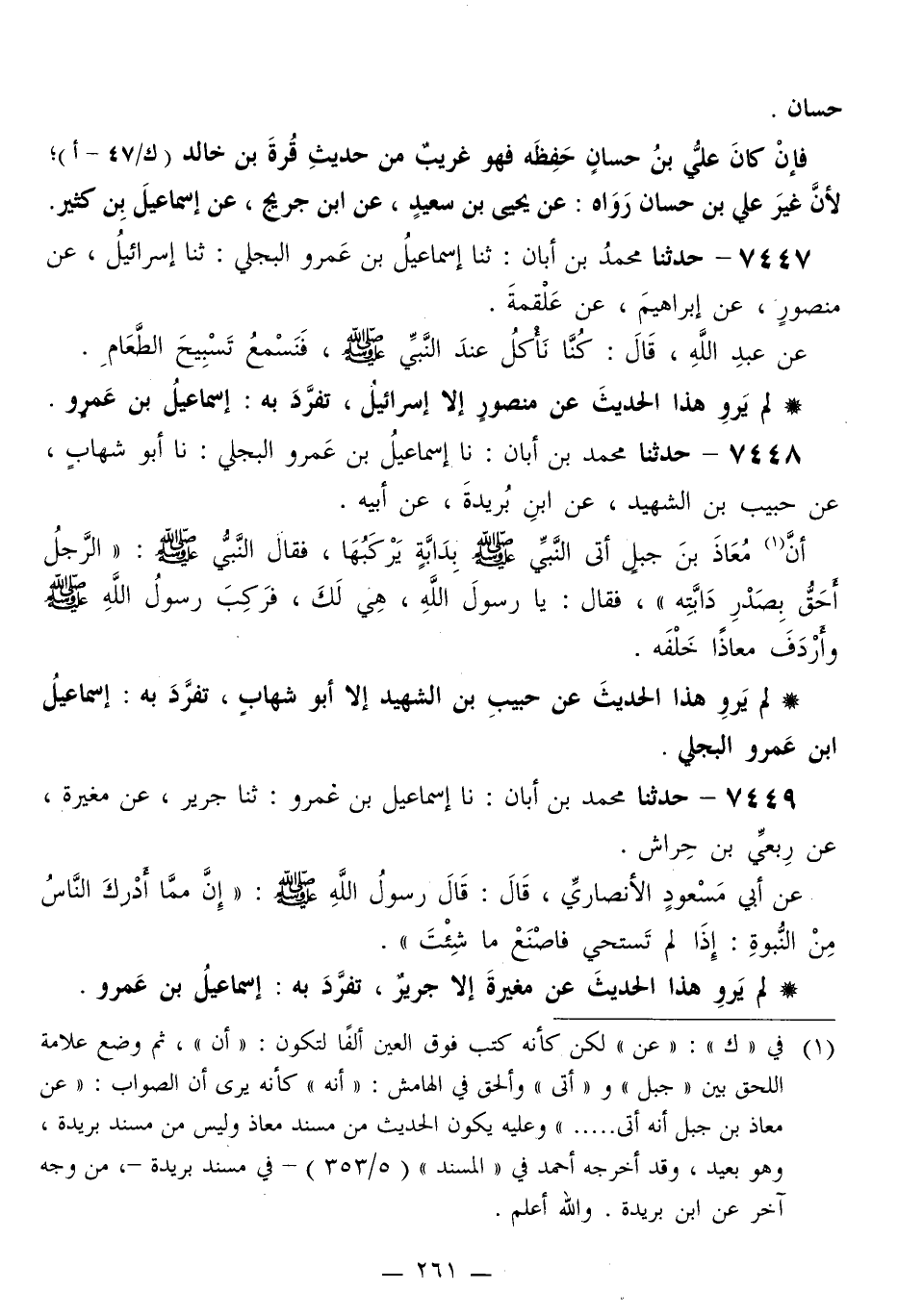 7448 - حَدَّثَنَا مُحَمَّدُ بْنُ أَبَانَ، نَا إِسْمَاعِيلُ بْنُ عَمْرٍو الْبَجَلِيُّ، نَا أَبُو شِهَابٍ، عَنْ حَبِيبِ بْنِ الشَّهِيدِ، عَنِ ابْنِ بُرَيْدَةَ، عَنْ أَبِيهِ، أَنَّ مُعَاذَ بْنَ جَبَلٍ، أَتَى النَّبِيَّ صَلَّى اللهُ عَلَيْهِ وَسَلَّمَ بِدَابَّةٍ يَرْكَبُهَا، فَقَالَ النَّبِيُّ صَلَّى اللهُ عَلَيْهِ وَسَلَّمَ: «§الرَّجُلُ أَحَقُّ بِصَدْرِ دَابَّتِهِ» ، فَقَالَ: يَا رَسُولَ اللَّهِ، هِيَ لَكَ، فَرَكِبَ رَسُولُ اللَّهِ صَلَّى اللهُ عَلَيْهِ وَسَلَّمَ وَأَرْدَفَ مُعَاذًا خَلْفَهُ «