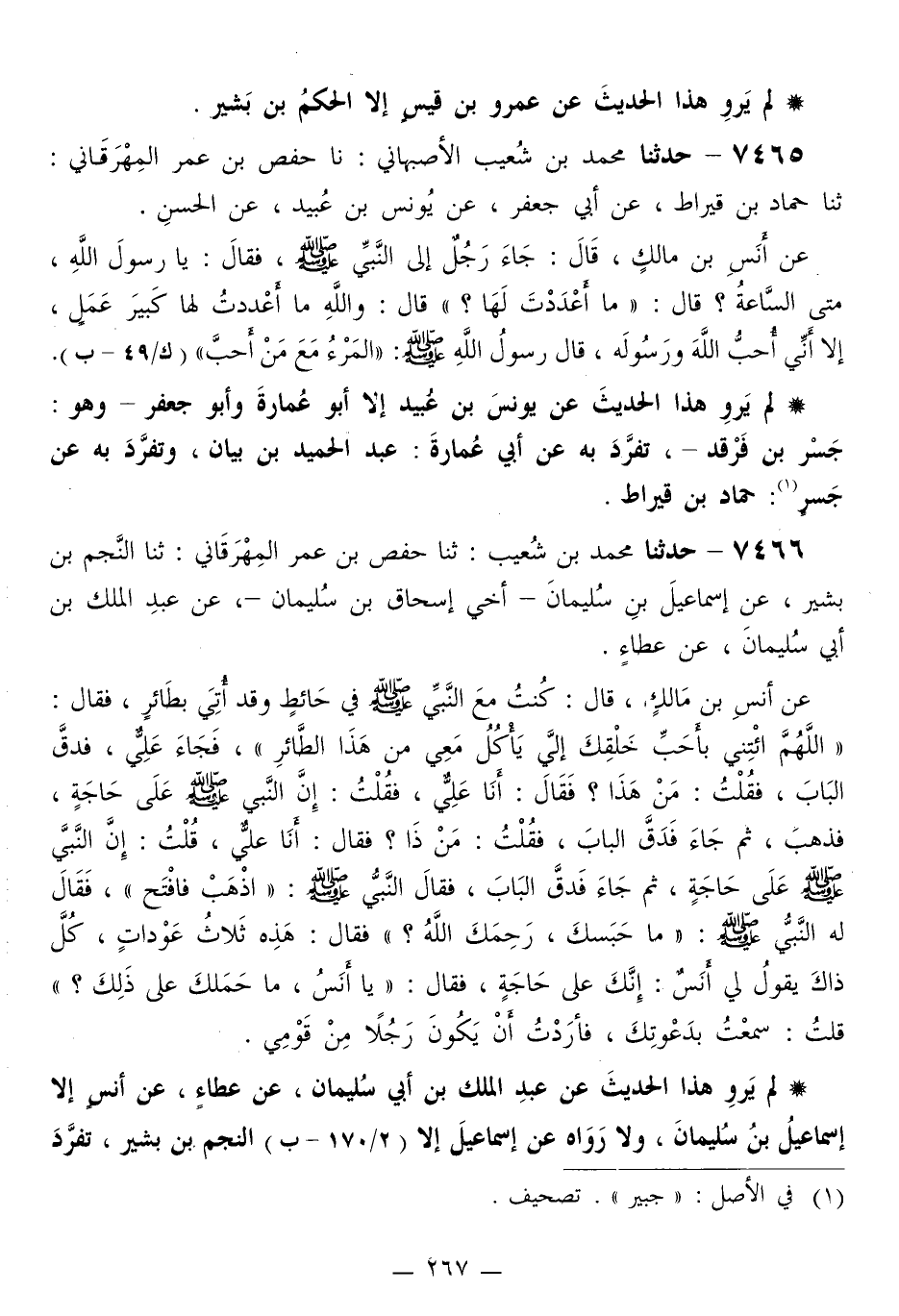 7466 - حَدَّثَنَا مُحَمَّدُ بْنُ شُعَيْبٍ، ثَنَا حَفْصُ بْنُ عُمَرَ الْمِهْرَقَانيُّ، ثَنَا النَّجْمُ بْنُ بَشِيرٍ، عَنْ إِسْمَاعِيلَ بْنِ سُلَيْمَانَ، أَخِي إِسْحَاقَ بْنِ سُلَيْمَانَ، عَنْ عَبْدِ الْمَلِكِ بْنِ أَبِي سُلَيْمَانَ، عَنْ عَطَاءٍ، عَنْ أَنَسِ بْنِ مَالِكٍ قَالَ: كُنْتُ مَعَ النَّبِيِّ صَلَّى اللهُ عَلَيْهِ وَسَلَّمَ فِي حَائِطٍ وَقَدْ أُتِيَ بطائرٍ، فَقَالَ: «§اللَّهُمَّ ائْتِنِي بِأَحَبِّ خَلْقِكَ إِلَيَّ يَأْكُلُ مَعِي مِنْ هَذَا الطَّائِرِ» ، فَجَاءَ عَلِيٌّ، فَدَقَّ الْبَابَ، فَقُلْتُ: مَنْ هَذَا؟ فَقَالَ: أَنَا عَلِيٌّ، فَقُلْتُ: إِنَّ النَّبِيَّ صَلَّى اللهُ عَلَيْهِ وَسَلَّمَ عَلَى حَاجَةٍ، فَذَهَبَ، ثُمَّ جَاءَ فَدَقَّ الْبَابَ، فَقُلْتُ: مَنْ ذَا؟ فَقَالَ: أَنَا عَلِيٌّ، قُلْتُ: إِنَّ النَّبِيَّ صَلَّى اللهُ عَلَيْهِ وَسَلَّمَ عَلَى حَاجَةٍ، ثُمَّ جَاءَ فَدَقَّ الْبَابَ، فَقَالَ النَّبِيُّ صَلَّى اللهُ عَلَيْهِ وَسَلَّمَ: «اذْهَبْ فَافْتَحْ» ، فَقَالَ لَهُ النَّبِيُّ صَلَّى اللهُ عَلَيْهِ وَسَلَّمَ: «مَا حَبَسَكَ، رَحِمَكَ اللَّهُ؟» فَقَالَ: هَذِهِ ثَلَاثُ دَعَوَاتٍ، كُلُّ ذَاكَ يَقُولُ لِي أَنَسٌ: إِنَّكَ عَلَى حَاجَةٍ، فَقَالَ: «يَا أَنَسُ، مَا حَمَلَكَ عَلَى ذَلِكَ؟» قُلْتُ: سَمِعْتُ بِدَعْوَتِكَ، فَأَرَدْتُ أَنْ يَكُونَ رَجُلًا مِنْ قَوْمِي «