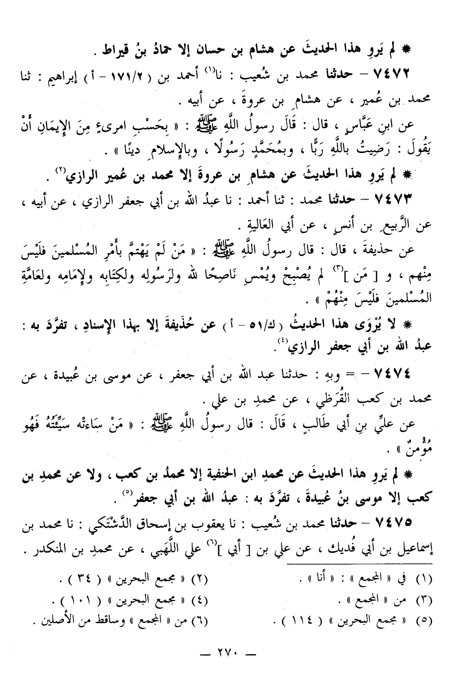 7473 - حَدَّثَنَا مُحَمَّدٌ، ثَنَا أَحْمَدُ، نَا عَبْدُ اللَّهِ بْنُ أَبِي جَعْفَرٍ الرَّازِيُّ، عَنْ أَبِيهِ، عَنِ الرَّبِيعِ بْنِ أَنَسٍ، عَنْ أَبِي الْعَالِيَةِ، عَنْ حُذَيْفَةَ قَالَ: قَالَ رَسُولُ اللَّهِ صَلَّى اللهُ عَلَيْهِ وَسَلَّمَ: «§مَنْ لَمْ يَهْتَمَّ بِأَمْرِ الْمُسْلِمِينَ فَلَيْسَ مِنْهُمْ، وَمَنْ لَمْ يُصْبِحْ وَيُمْسِ نَاصِحًا لِلَّهِ وَلِرَسُولِهِ وَلِكِتَابِهِ ولإِمَامِهِ ولِعَامَّةِ الْمُسْلِمِينَ فَلَيْسَ مِنْهُمْ»
