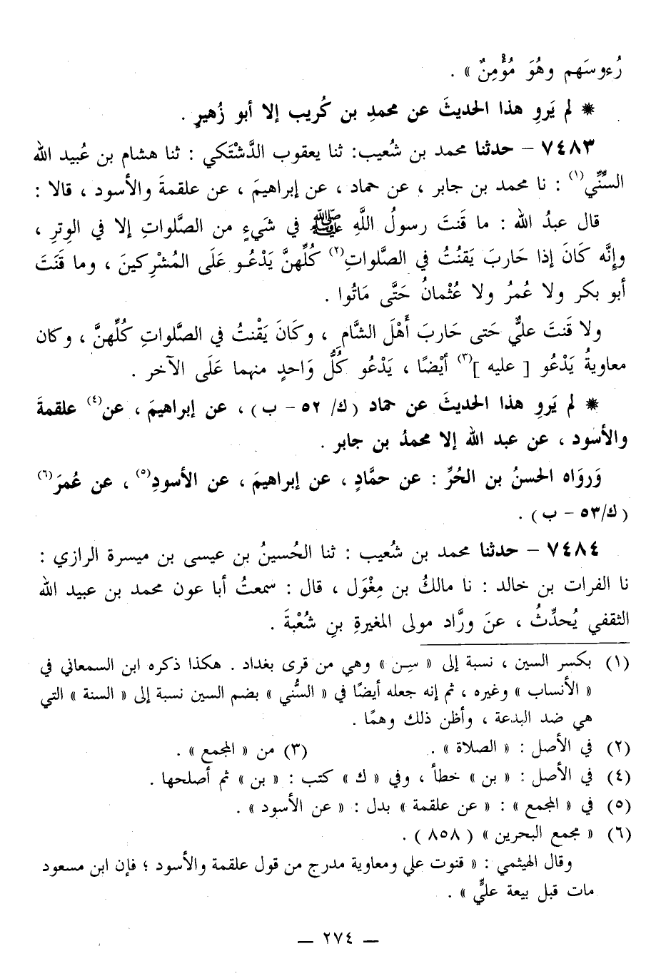 7483 - حَدَّثَنَا مُحَمَّدُ بْنُ شُعَيْبٍ، ثَنَا يَعْقُوبُ الدَّشْتَكِيُّ، ثَنَا هِشَامُ بْنُ عُبَيْدِ اللَّهِ السَّبْتِيُّ، نَا مُحَمَّدُ بْنُ جَابِرٍ، عَنْ حَمَّادٍ، عَنْ إِبْرَاهِيمَ، عَنْ عَلْقَمَةَ، وَالْأَسْوَدِ، قَالَا: قَالَ عَبْدُ اللَّهِ: «§مَا قَنَتَ رَسُولُ اللَّهِ صَلَّى اللهُ عَلَيْهِ وَسَلَّمَ فِي شَيْءٍ مِنَ الصَّلَوَاتِ إِلَّا فِي الْوِتْرِ، وَإِنَّهُ كَانَ إِذَا حَارَبَ يَقْنُتُ فِي الصَّلَوَاتِ كُلِّهِنَّ يَدْعُو عَلَى الْمُشْرِكِينَ» وَمَا قَنَتَ أَبُو بَكْرٍ، وَلَا عُمَرُ، وَلَا عُثْمَانُ، حَتَّى مَاتُوا «وَلَا قَنَتَ عَلِيٌّ، حَتَّى حَارَبَ أَهْلَ الشَّامِ، وَكَانَ يَقْنُتُ فِي الصَّلَوَاتِ كُلِّهِنَّ، وَكَانَ مُعَاوِيَةُ، يَدْعُو عَلَيْهِ أَيْضًا، يَدْعُو كُلُّ وَاحِدٍ مِنْهُمَا عَلَى الْآخَرِ»