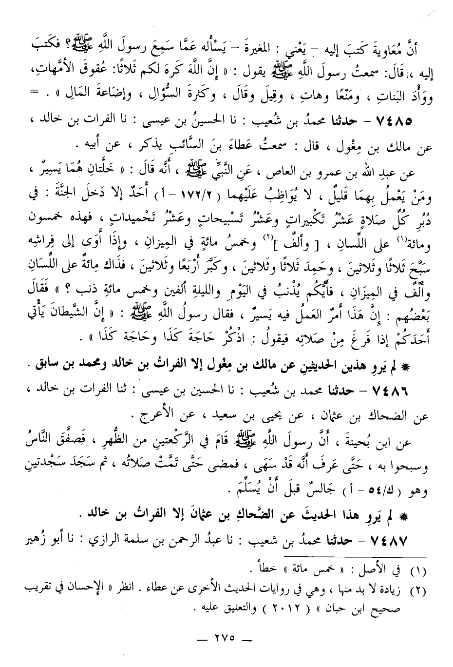 7485 - حَدَّثَنَا مُحَمَّدُ بْنُ شُعَيْبٍ، نَا الْحُسَيْنُ بْنُ عِيسَى، نَا الْفُرَاتُ بْنُ خَالِدٍ، عَنْ مَالِكِ بْنِ مِغْوَلٍ قَالَ: سَمِعْتُ عَطَاءَ بْنَ السَّائِبِ، يَذْكُرُ عَنْ أَبِيهِ، عَنْ عَبْدِ اللَّهِ بْنِ عَمْرِو بْنِ الْعَاصِ، عَنِ النَّبِيِّ صَلَّى اللهُ عَلَيْهِ وَسَلَّمَ، أَنَّهُ قَالَ: «§خَلَّتَانِ هُمَا يَسِيرٌ، وَمَنْ يَعْمَلُ بِهِمَا قَلِيلٌ، لَا يُوَاظِبُ عَلَيْهِمَا أَحَدٌ إِلَّا دَخَلَ الْجَنَّةَ: فِي دُبُرِ كُلِّ صَلَاةٍ عَشْرُ تَكْبِيرَاتٍ، وَعَشْرُ تَسْبِيحَاتٍ، وَعَشْرُ تَحْمِيدَاتٍ، فَهَذِهِ خَمْسُونَ وَمِائَةٌ عَلَى اللِّسَانِ، وَأَلْفٌ وَخَمْسُمِائَةٍ فِي الْمِيزَانِ، وَإِذَا أَوَى إِلَى فِرَاشِهِ سَبَّحَ ثَلَاثًا وَثَلَاثِينَ، وَحَمِدَ ثَلَاثًا وَثَلَاثِينَ، وَكَبَّرَ أَرْبَعًا وَثَلَاثِينَ، فَذَاكَ مِائَةٌ عَلَى اللِّسَانِ وَأَلْفٌ فِي الْمِيزَانِ، فَأَيُّكُمْ يُذْنِبُ فِي الْيَوْمِ وَاللَّيْلَةِ أَلْفَيْنِ وَخَمْسَمِائَةِ ذَنْبٍ؟» فَقَالَ بَعْضُهُمْ: إِنَّ هَذَا أَمْرٌ الْعَمَلُ فِيهِ يَسِيرٌ، فَقَالَ رَسُولُ اللَّهِ صَلَّى اللهُ عَلَيْهِ وَسَلَّمَ: «إِنَّ الشَّيْطَانَ يَأْتِي أَحَدَكُمْ إِذَا فَرَغَ مِنْ صَلَاتِهِ فَيَقُولُ: اذْكُرْ حَاجَةَ كَذَا وَحَاجَةَ كَذَا»