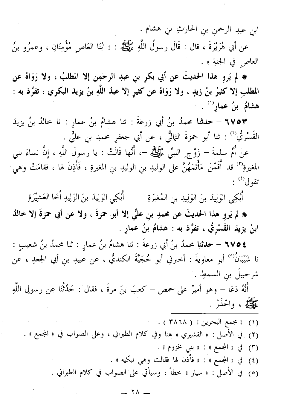 6753 - حَدَّثَنَا مُحَمَّدُ بْنُ أَبِي زُرْعَةَ، ثَنَا هِشَامُ بْنُ عَمَّارٍ، نَا خَالِدُ بْنُ يَزِيدَ الْقَسْرِيُّ، ثَنَا أَبُو حَمْزَةَ الثُّمَالِيُّ، عَنْ أَبِي جَعْفَرٍ مُحَمَّدِ بْنِ عَلِيٍّ، عَنْ أُمِّ سَلَمَةَ، زَوْجِ النَّبِيِّ صَلَّى اللهُ عَلَيْهِ وَسَلَّمَ أَنَّهَا قَالَتْ: يَا رَسُولَ اللَّهِ، إِنَّ §نِسَاءَ بَنِي الْمُغِيرَةِ قَدْ أَقَمْنَ مَأْتَمَهُنَّ عَلَى الْوَلِيدِ بْنِ الْوَلِيدِ بْنِ الْمُغِيرَةِ، «فَأَذِنَ لَهَا» ، فَقَامَتْ وَهِيَ تَقُولُ: