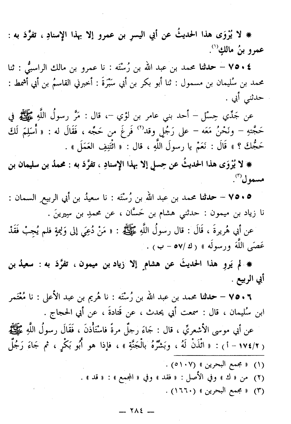 7504 - حَدَّثَنَا مُحَمَّدُ بْنُ عَبْدِ اللَّهِ بْنِ رُسْتَهْ، نَا عَمْرُو بْنُ مَالِكٍ الرَّاسِبِيُّ، ثَنَا مُحَمَّدُ بْنُ سُلَيْمَانَ بْنِ مَسْمُولٍ، ثَنَا أَبُو بَكْرِ بْنُ أَبِي سَبْرَةَ، أَخْبَرَنِي الْقَاسِمُ بْنُ أَبِي أَشْمَطَ، حَدَّثَنِي أَبِي، عَنْ جَدِّي حِسْلٍ، أَحَدِ بَنِي عَامِرِ بْنِ لُؤَيٍّ قَالَ: مَرَّ رَسُولُ اللَّهِ صَلَّى اللهُ عَلَيْهِ وَسَلَّمَ فِي حَجَّتِهِ وَنَحْنُ مَعَهُ عَلَى رَجُلٍ وَقَدْ فَرَغَ مِنْ حَجِّهِ، فَقَالَ لَهُ: «§أَسَلِمَ لَكَ حَجُّكَ؟» قَالَ: نَعَمْ يَا رَسُولَ اللَّهِ قَالَ: «ائْتَنِفِ الْعَمَلَ»