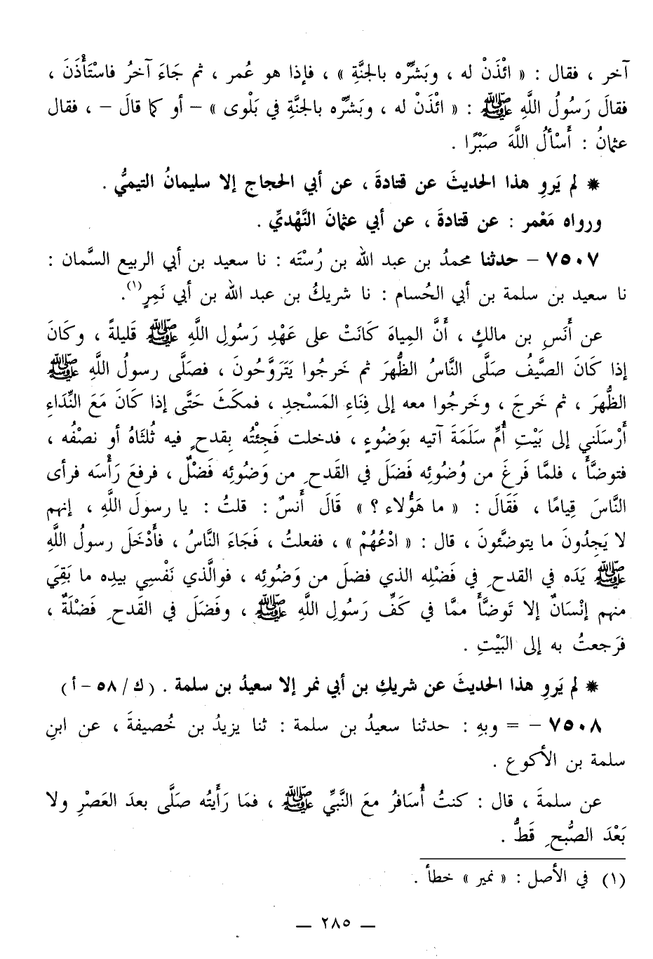 7507 - حَدَّثَنَا مُحَمَّدُ بْنُ عَبْدِ اللَّهِ بْنِ رُسْتَهْ، نَا سَعِيدُ بْنُ أَبِي الرَّبِيعِ السَّمَّانُ، نَا سَعِيدُ بْنُ سَلَمَةَ بْنِ أَبِي الْحُسَامِ، نَا شَرِيكُ بْنُ عَبْدِ اللَّهِ بْنِ أَبِي نَمِرٍ، عَنْ أَنَسِ بْنِ مَالِكٍ، أَنَّ الْمِيَاهَ كَانَتْ عَلَى عَهْدِ رَسُولِ اللَّهِ صَلَّى اللهُ عَلَيْهِ وَسَلَّمَ قَلِيلَةً، وَكَانَ إِذَا كَانَ الصَّيْفُ صَلَّى النَّاسُ الظُّهْرَ ثُمَّ خَرَجُوا يَتَرَوَّحُونَ، فَصَلَّى رَسُولُ اللَّهِ صَلَّى اللهُ عَلَيْهِ وَسَلَّمَ الظُّهْرَ، ثُمَّ خَرَجَ وَخَرَجُوا مَعَهُ إِلَى فِنَاءِ الْمَسْجِدِ، فَمَكَثَ حَتَّى إِذَا كَانَ مَعَ النِّدَاءِ أَرْسَلَنِي إِلَى بَيْتِ أُمِّ سَلَمَةَ آتِيهِ بِوَضُوءٍ، فَدَخَلْتُ فَجِئْتُهُ بِقَدَحٍ فِيهِ ثُلُثَاهُ أَوْ نِصْفُهُ، فَتَوَضَّأَ، فَلَمَّا فَرَغَ مِنْ وُضُوئِهِ فَضَلَ فِي الْقَدَحِ مِنْ وَضُوئِهِ فَضْلٌ، فَرَفَعَ رَأْسَهُ فَرَأَى النَّاسَ قِيَامًا، فَقَالَ: «مَا هَؤُلَاءِ؟» قَالَ أَنَسٌ: قُلْتُ: يَا رَسُولَ اللَّهِ، إِنَّهُمْ لَا يَجِدُونَ مَا يَتَوَضَّئُونَ قَالَ: «ادْعُهُمْ» ، فَفَعَلْتُ، فَجَاءَ النَّاسُ، §فَأَدْخَلَ رَسُولُ اللَّهِ صَلَّى اللهُ عَلَيْهِ وَسَلَّمَ يَدَهُ فِي الْقَدَحِ فِي فَضْلِهِ الَّذِي فَضَلَ مِنْ وَضُوئِهِ، فَوَالَّذِي نَفْسِي بِيَدِهِ مَا بَقِيَ مِنْهُمْ إِنْسَانٌ إِلَّا تَوَضَّأَ مِمَّا فِي كَفِّ رَسُولِ اللَّهِ صَلَّى اللهُ عَلَيْهِ وَسَلَّمَ، وَفَضَلَ فِي الْقَدَحِ فَضْلَةٌ، فَرَجَعْتُ بِهِ إِلَى الْبَيْتِ «