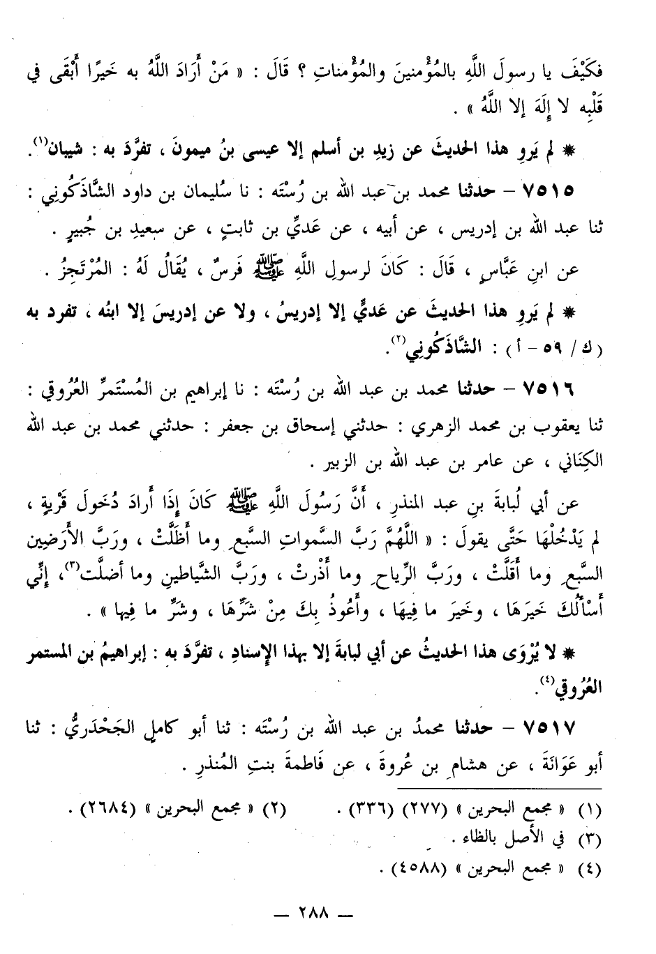 7516 - حَدَّثَنَا مُحَمَّدُ بْنُ عَبْدِ اللَّهِ بْنِ رُسْتَهْ، نَا إِبْرَاهِيمُ بْنُ الْمُسْتَمِرِّ الْعُرُوقِيُّ، ثَنَا يَعْقُوبُ بْنُ مُحَمَّدٍ الزُّهْرِيُّ، حَدَّثَنِي إِسْحَاقُ بْنُ جَعْفَرٍ، حَدَّثَنِي مُحَمَّدُ بْنُ عَبْدِ اللَّهِ الْكِنَانِيُّ، عَنْ عَامِرِ بْنِ عَبْدِ اللَّهِ بْنِ الزُّبَيْرِ، عَنْ أَبِي لُبَابَةَ بْنِ عَبْدِ الْمُنْذِرِ، أَنَّ رَسُولَ اللَّهِ صَلَّى اللهُ عَلَيْهِ وَسَلَّمَ كَانَ §إِذَا أَرَادَ دُخُولَ قَرْيَةٍ، لَمْ يَدْخُلْهَا حَتَّى يَقُولَ: «اللَّهُمَّ رَبَّ السَّمَوَاتِ السَّبْعِ وَمَا أَظَلَّتْ، وَرَبَّ الْأَرَضِينَ السَّبْعِ وَمَا أَقَلَّتْ، وَرَبَّ الرِّيَاحِ وَمَا أَذْرَتْ، وَرَبَّ الشَّيَاطِينِ وَمَا أَضَلَّتْ، إِنِّي أَسْأَلُكَ خَيْرَهَا، وَخَيْرَ مَا فِيهَا، وَأَعُوذُ بِكَ مِنْ شَرِّهَا، وَشَرِّ مَا فِيهَا»