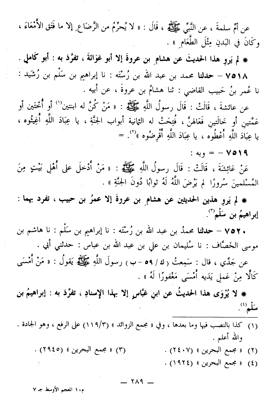 7518 - حَدَّثَنَا مُحَمَّدُ بْنُ عَبْدِ اللَّهِ بْنِ رُسْتَهْ، نَا إِبْرَاهِيمُ بْنُ سَلْمِ بْنِ رُشَيْدٍ، نَا عُمَرُ بْنُ حَبِيبٍ الْقَاضِي، ثَنَا هِشَامُ بْنُ عُرْوَةَ، عَنْ أَبِيهِ، عَنْ عَائِشَةَ، قَالَتْ: قَالَ رَسُولُ اللَّهِ صَلَّى اللهُ عَلَيْهِ وَسَلَّمَ: «§مَنْ كُنَّ لَهُ ابْنَتَانِ أَوْ أُخْتَانِ أَوْ عَمَّتَانِ أَوْ خالَتَانِ فَعَالَهُنَّ، فُتِحَتْ لَهُ الثَّمَانِيَةُ أَبْوَابُ الْجَنَّةِ، يَا عِبَادَ اللَّهِ أَغِيثُوهُ، يَا عِبَادَ اللَّهِ أَعْطُوهُ، يَا عِبَادَ اللَّهِ أَقْرِضُوهُ»
