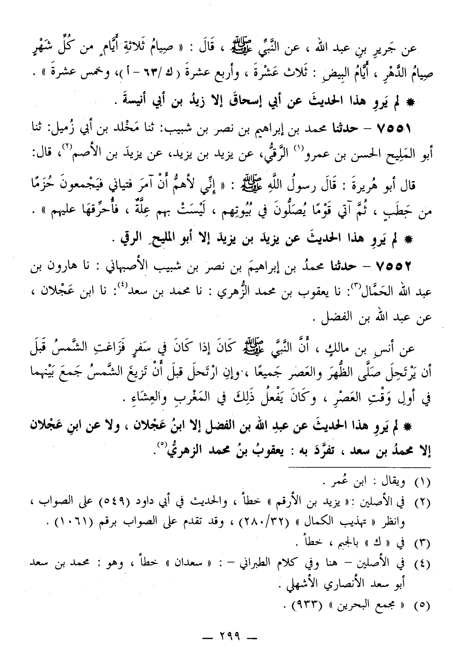 7551 - حَدَّثَنَا مُحَمَّدُ بْنُ إِبْرَاهِيمَ بْنِ نَصْرِ بْنِ شَبِيبٍ، ثَنَا مَخْلَدُ بْنُ أَبِي زُمَيْلٍ، ثَنَا أَبُو الْمَلِيحِ الْحَسَنُ بْنُ عَمْرٍو الرَّقِّيُّ، عَنْ يَزِيدَ بْنِ يَزِيدَ، عَنْ يَزِيدَ بْنِ الْأَصَمِّ قَالَ: قَالَ أَبُو هُرَيْرَةَ: قَالَ رَسُولُ اللَّهِ صَلَّى اللهُ عَلَيْهِ وَسَلَّمَ: «§إِنِّي لَأَهُمُّ أَنْ آمُرَ فِتْيَانِي فَيَجْمَعُونَ حُزَمًا مِنْ حَطَبٍ، ثُمَّ آتِي قَوْمًا يُصَلُّونَ فِي بُيُوتِهِمْ، لَيْسَتْ بِهِمْ عِلَّةٌ، فَأُحَرِّقُهَا عَلَيْهِمْ»