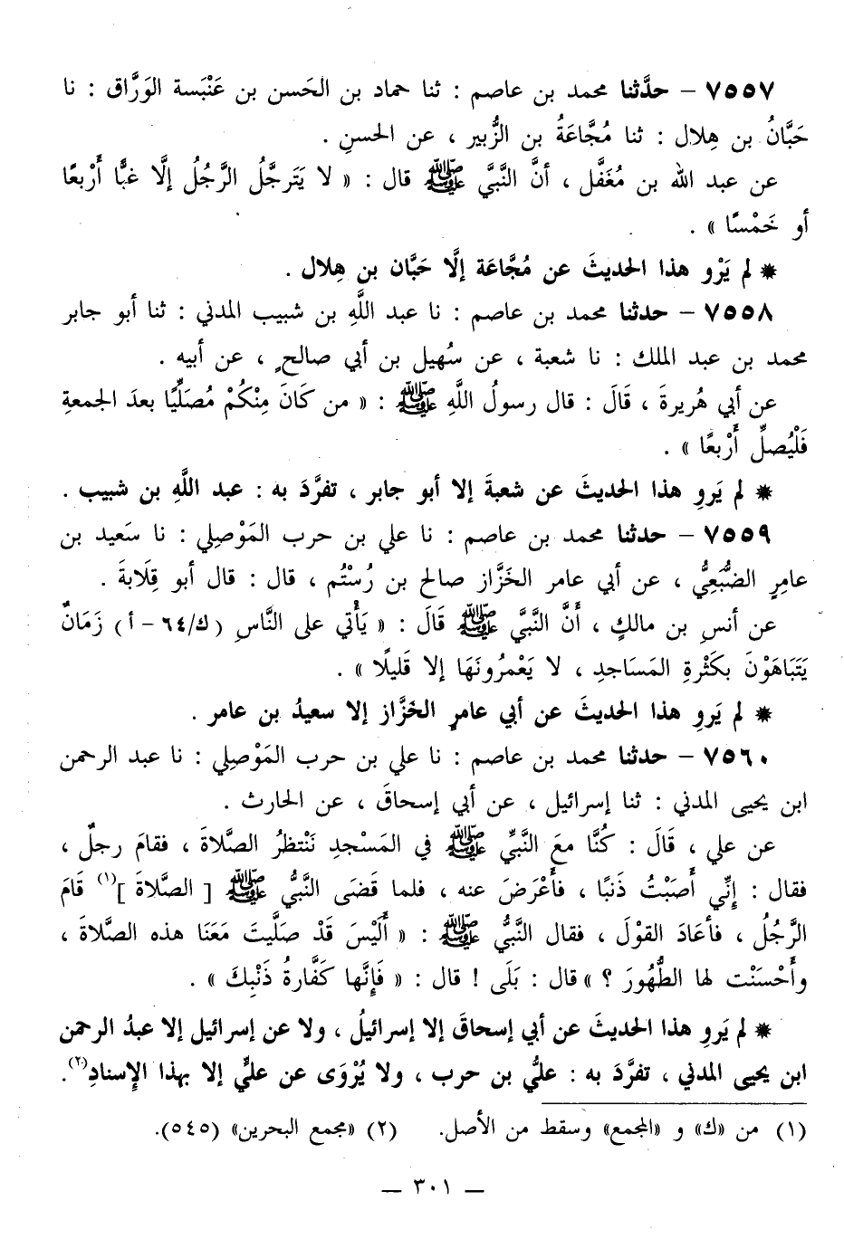 7560 - حَدَّثَنَا مُحَمَّدُ بْنُ عَاصِمٍ، نَا عَلِيُّ بْنُ حَرْبٍ الْمُوصِلِيُّ، نَا عَبْدُ الرَّحْمَنِ بْنُ يَحْيَى الْمَدَنِيُّ، ثَنَا إِسْرَائِيلُ، عَنْ أَبِي إِسْحَاقَ، عَنِ الْحَارِثِ، عَنْ عَلِيٍّ قَالَ: كُنَّا مَعَ النَّبِيِّ صَلَّى اللهُ عَلَيْهِ وَسَلَّمَ فِي الْمَسْجِدِ نَنْتَظِرُ الصَّلَاةَ، فَقَامَ رَجُلٌ، فَقَالَ: إِنِّي أَصَبْتُ ذَنْبًا، فَأَعْرَضَ عَنْهُ، فَلَمَّا قَضَى النَّبِيُّ صَلَّى اللهُ عَلَيْهِ وَسَلَّمَ الصَّلَاةَ قَامَ الرَّجُلُ، فَأَعَادَ الْقَوْلَ، فَقَالَ النَّبِيُّ صَلَّى اللهُ عَلَيْهِ وَسَلَّمَ: «§أَلَيْسَ قَدْ صَلَّيْتَ مَعَنَا هَذِهِ الصَّلَاةَ، وَأَحْسَنْتَ لَهَا الطَّهُورَ؟» قَالَ: بَلَى قَالَ: «فَإِنَّهَا كَفَّارَةُ ذَنْبِكَ»